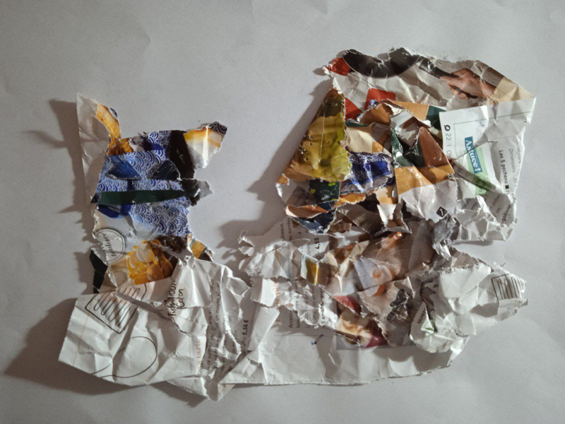 Pendant 1 minute, j’ai fait 12 gestes différents destructeurs (déchirer, couper, froisser, rouler, écraser) sur une feuille de magasine.