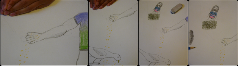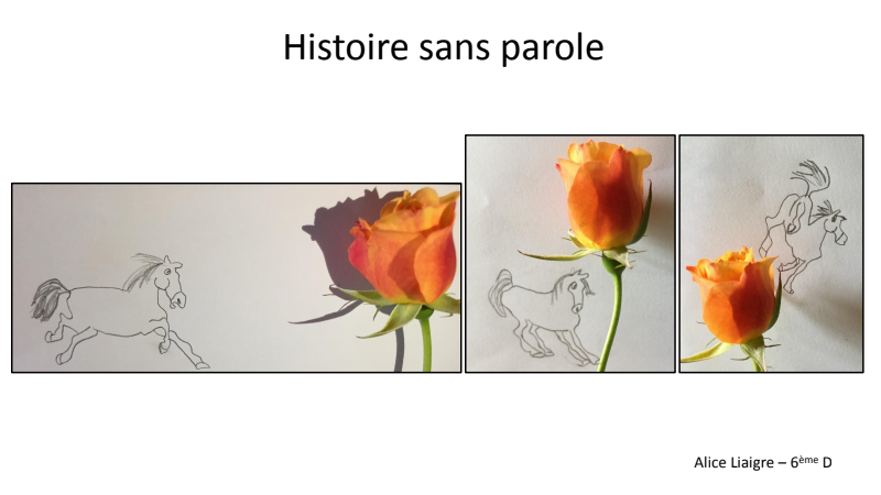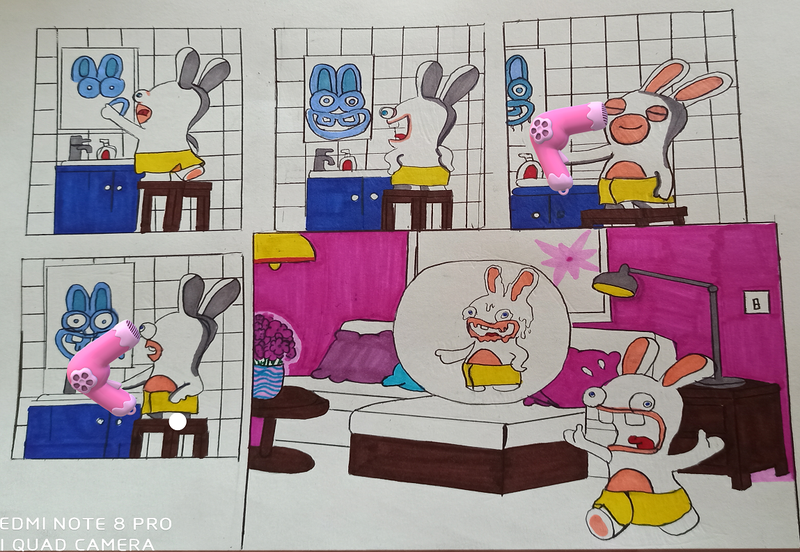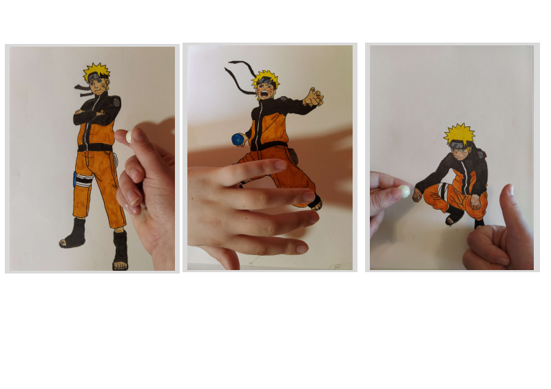 J’ai fait trois vignettes avec Naruto qui est mon personnage préféré de Manga. J’ai cherché sur Internet les images de Naruto pour faire mon histoire. J’ai décalqué sur des feuilles de canson grâce à ma tablette lumineuse puis colorié Naruto