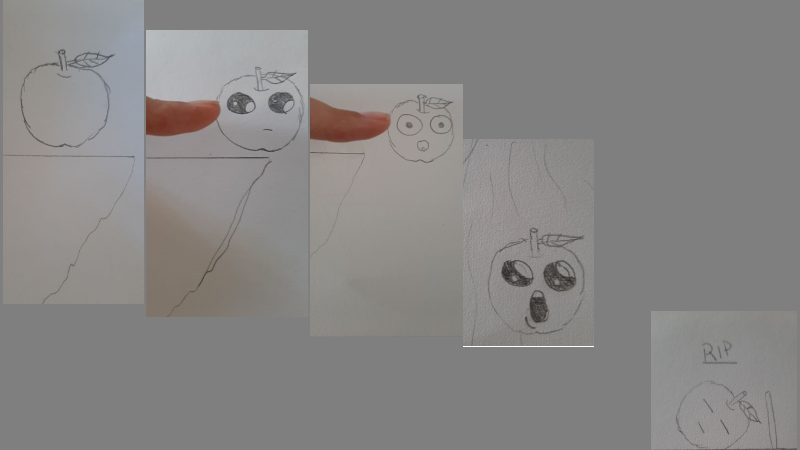 j'ai décidée de dessiner une pomme avec mon doigt qui la pousse la pomme au bord d'une falaise.
