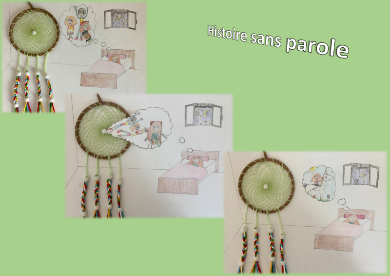 Pour mon travail, j'ai imaginé une petite fille qui faisait un cauchemar et l'attrape-rêve (mon objet magique !) aspire ce cauchemar dans la perle du milieu. La petite fille fait maintenant un beau rêve !