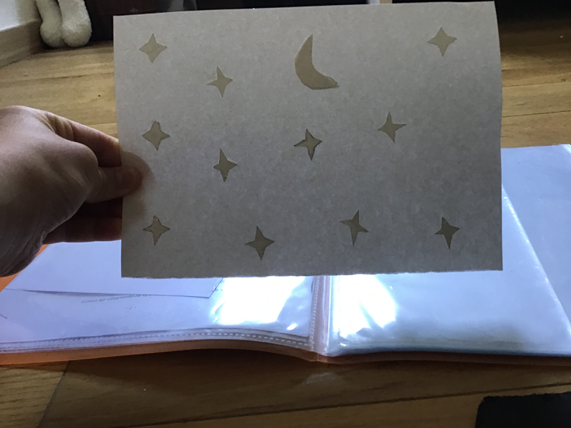 J’ai fait un ciel étoilé, pour la lune j’ai fait plusieurs lune et je l’es est collé ensemble puis j’ai plié ma feuille en 4 et j’ai découpé des étoiles pour en faire plusieurs d’un coup en suite au moment de prendre la photo j’ai jouer avec la lumière de ma chambre pour faire une couleur différente sur la lune et les étoiles.