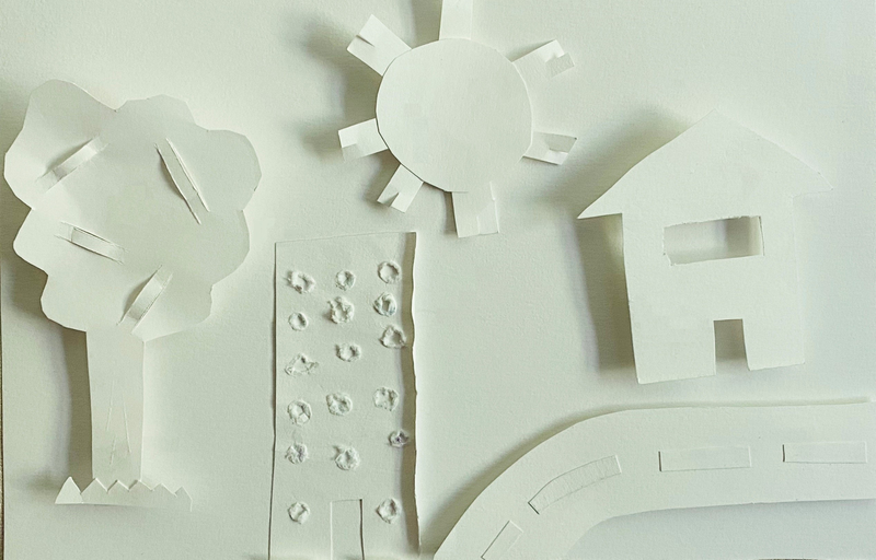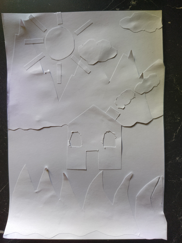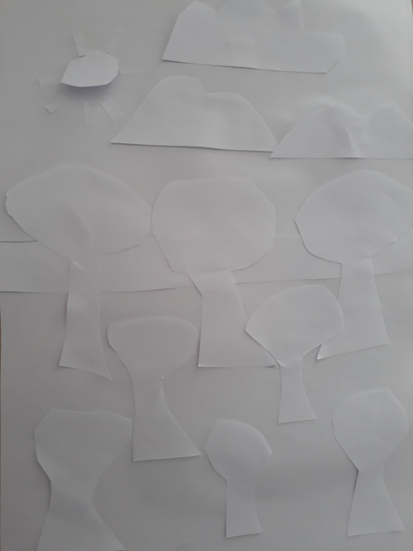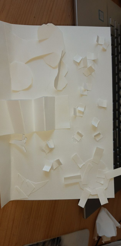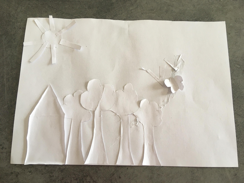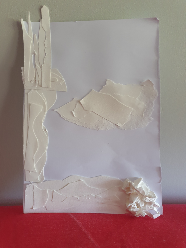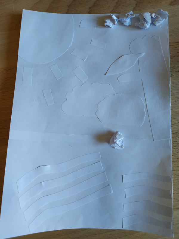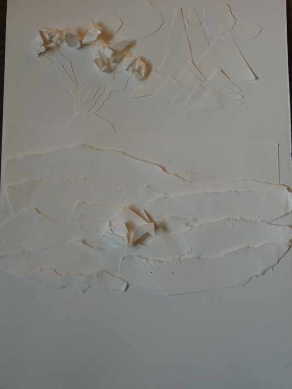 Pour former le tronc de l'arbre, la plage, les nuages et les montagnes, j'avais besoin de pouvoir donner une forme précise et le meilleur outil pour ça était les ciseaux. Le papier pour la mer est déchiré pour donner une impression de mouvement. Les feuilles sont en papier froissé pour faire un effet buissonnant. Pour montrer que la mer vivante j'ai fait un poisson en origami.
