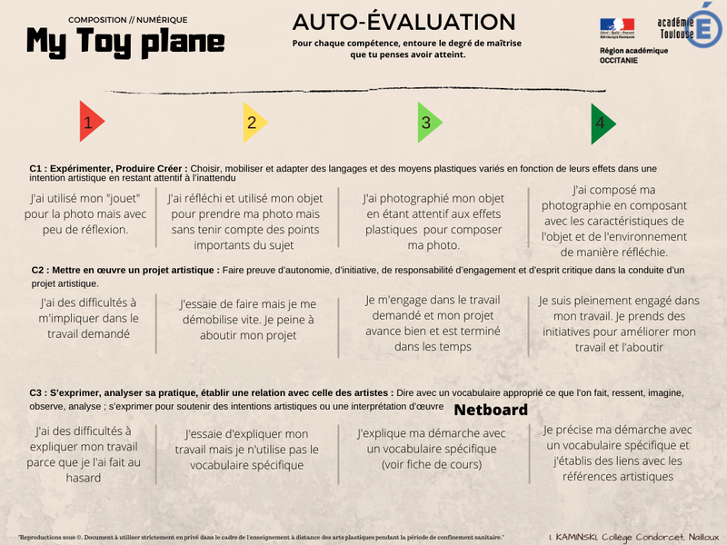 Faire l'auto-évaluation sous forme d'activité, dans le cahier de texte le jour du dépôt de votre travail.