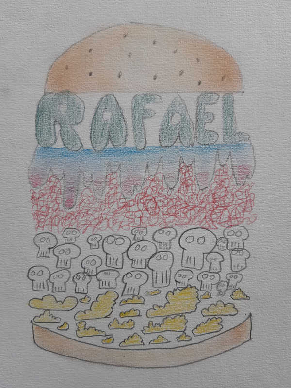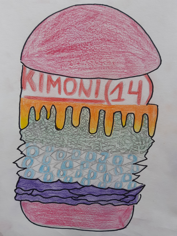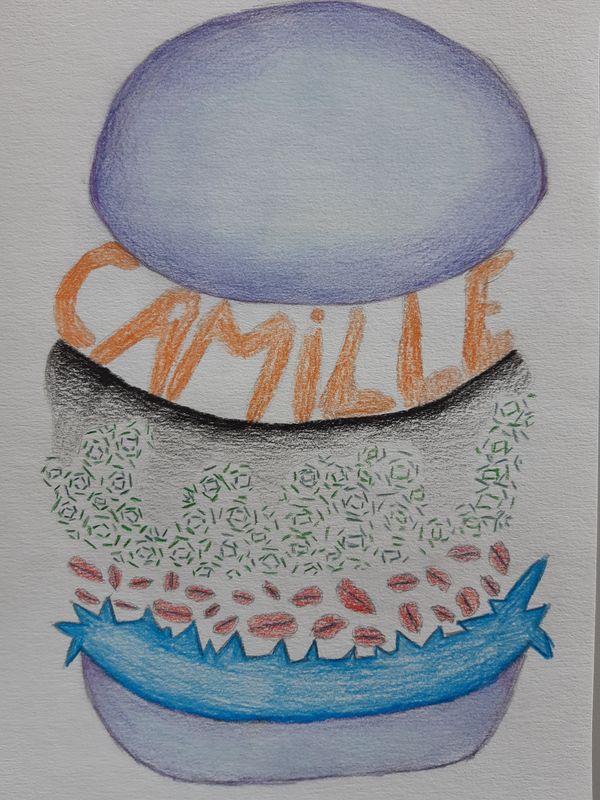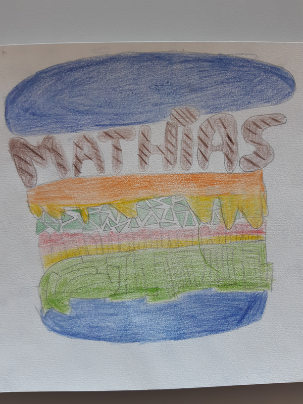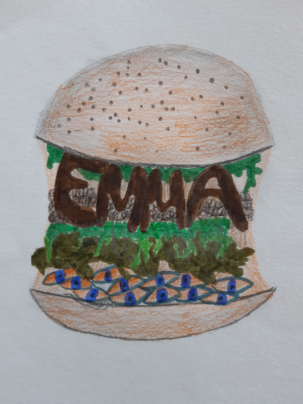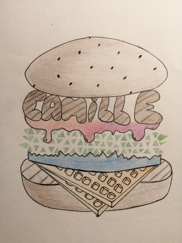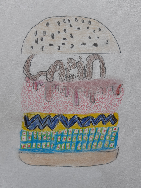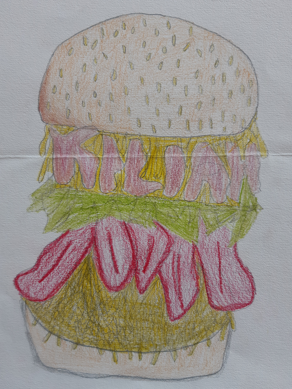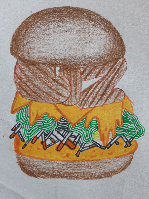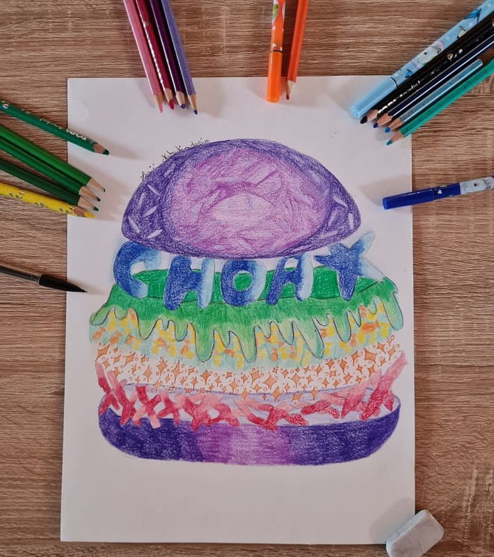J'ai fait ce burger sur le thème de la mer pour rapport à mon surnom , j'ai d'abord dessiné le chapeau sans le colorier puis j'ai ecrit "choa " mais comme il restait un grand espace j'ai rajouté une étoile , et j'ai dessidé de le colorier en deux type de bleu (foncé et clair ) pour faire un plus beau effet , après j'ai colorier le "fromage " en vert pour faire un peu comme une algue puis je l'ai estomper pour faire un dégradé . Après j'ai décidé de faire le chapeau en violet pour le relié en quelques sortes au bleu ,puis j'ai dessiné des poissons des deux couleurs différentes (jaune et orange ) en faisant un fond turquoise . Après j'ai fait des étoiles orange et comme garniture des verres de terre de différentes type de rose et j'ai refermé mon burger avec du pain violet comme le chapeau . Pour se dessin j'ai utilisé uniquement des crayons de couleurs .