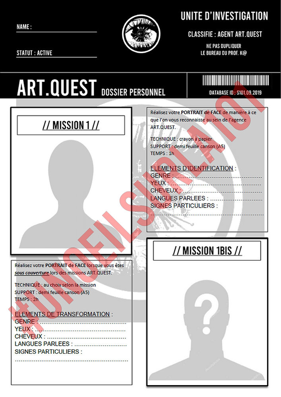 RAPPORT DE MISSION 1, DU 16/09/2019, 10h30 10h35 : L'agent K@ accueille ses nouveaux agents dans la salle 101. 10h40 : Les agents accèdent pour la première fois aux dossiers de leur mission première : se créer une identité d'agent ART.QUEST.10h50 : Les agents, munis de leur photographie d'identité "civile" procèdent à une représentation chronométrée de leur visage. Seuls les traits caractéristiques sont retenus.Rapidité, esprit de synthèse, observation, organisation, écoute, concentration, maîtr