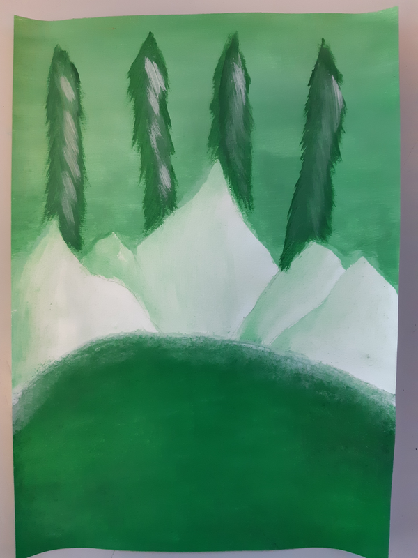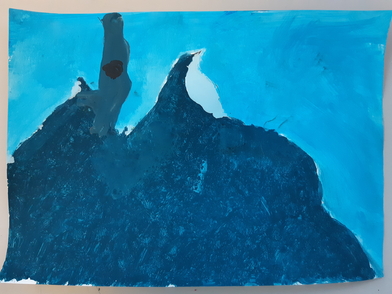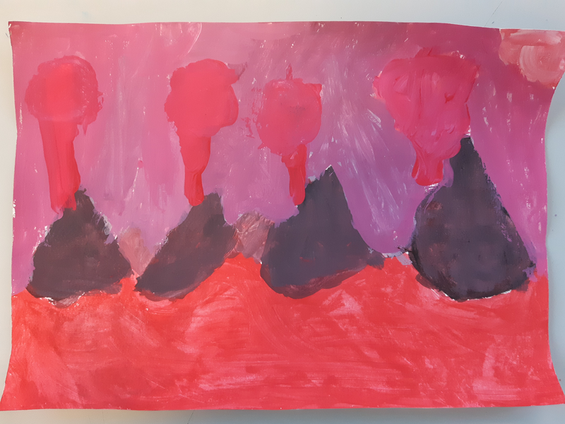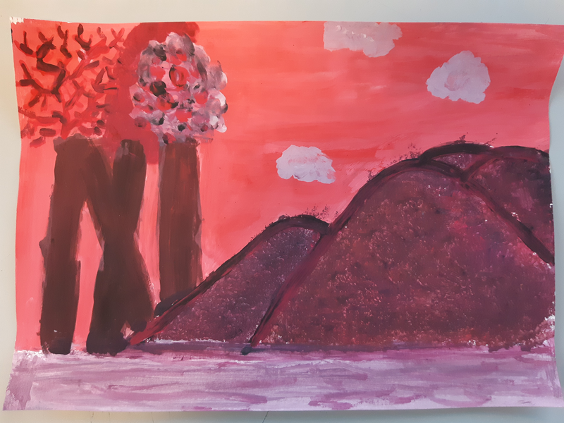 Pour réaliser mon Camaïeu, j'ai mélangé les couleurs pour faire plusieurs différente nuance de rouge.Avec le noir on fait des couleurs foncés,avec du blanc on fait des couleurs claires. J'ai utilisé l'éponge pour faire la mer en tamponnant.Pour le ciel j'ai mélangé beaucoup de noir avec
