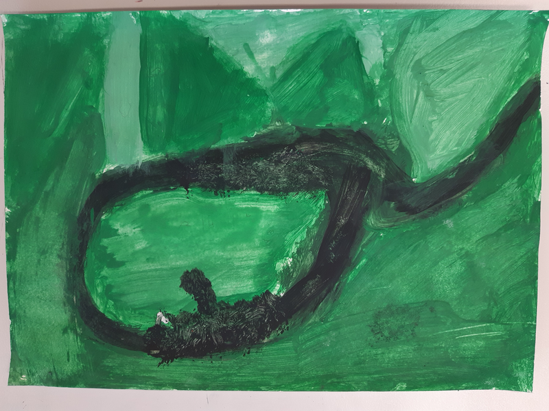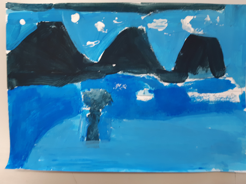 Pour faire mes collines j'ai utilisé un bleu foncé je l'ai réalisé avec un pinceau épais et un pinceau fin pour les contours ,j'aime cette étape car elle me donne une sensation de relief.