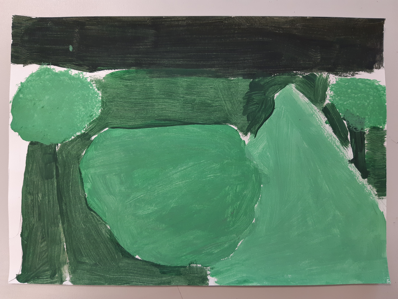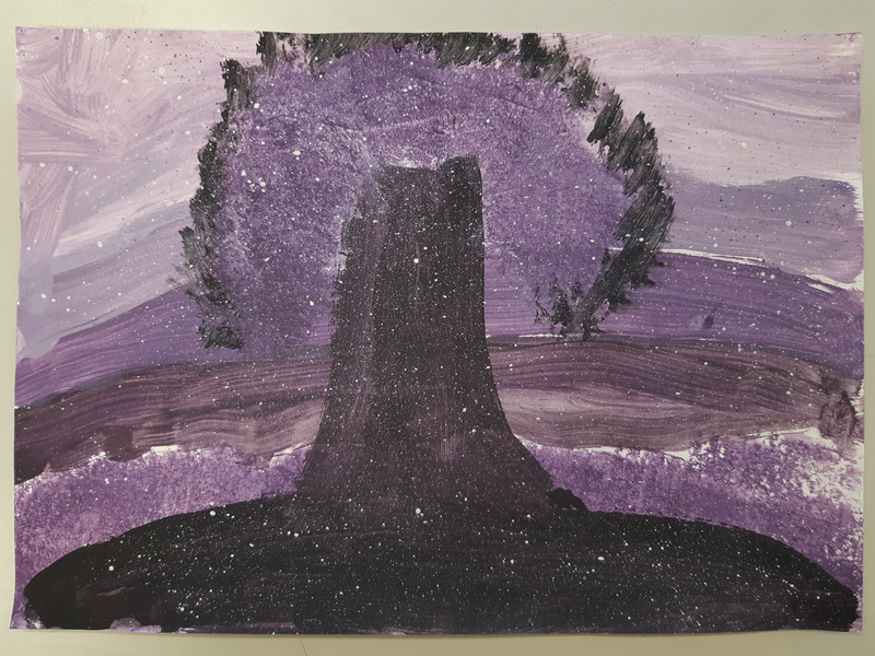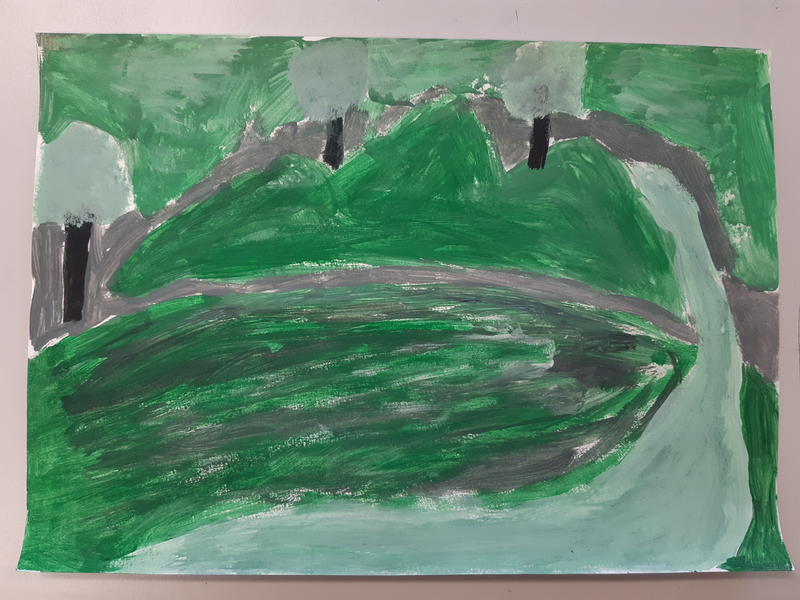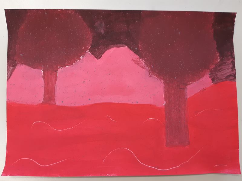 Pour mon arbre j'ai utilisé un bleu moyen, j'ai fait du pointillisme pour faire les feuilles cela m'a donné un effet de matière épais et de relief j'ai trouvé compliquer de faire le pointillisme car à chaque fois le pinceau glisser et ça faisait une grosse tache.