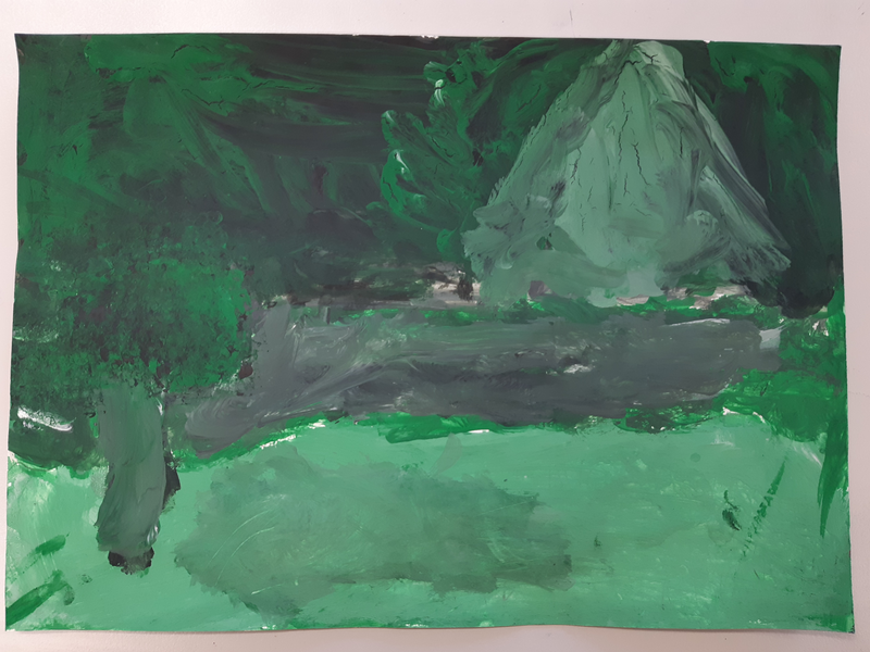 J'ai fait un paysage avec un, une montagne et un lac avec une éponge, et deux pinceaux. C'est vert comme, comme les arbres, comme l'herbe et comme le lac. Ce paysage est fait en camaïeu pour rendre plus réaliste. Grâce aux couleurs blanc et noir, j'ai pu rendre mon vert plus foncé et plus clair pour donner cette image en haut en lavis comme vous pouvez le voir. En premier plan, nous pouvons apercevoir de l'herbe avec un arbre suivi d'un lac vert et de beaucoup d'herbe. Et une montagne avec un ciel vert en arrière-plan. Pour la matière c'est lisse en bas et un peu gras en haut. Et parfois c'était compliqué car on pouvait confondre deux choses.