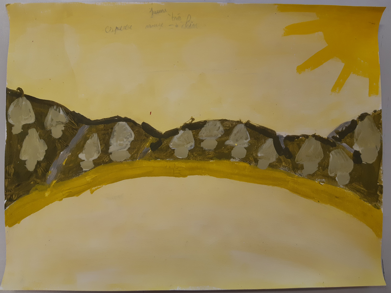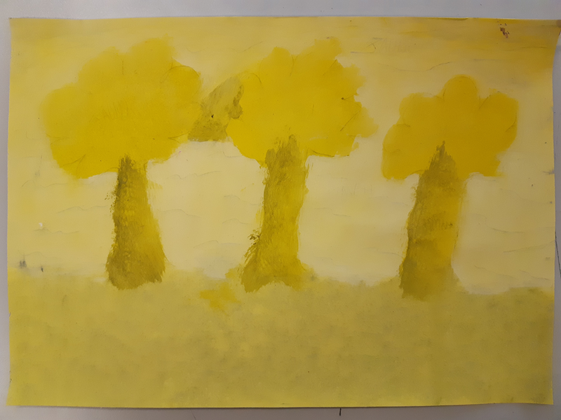 J'ai realisé un paysage en camaieu de couleur jaune. Pour ca j'ai utilisé un pinceau pour faire le ciel et la mer lisse, une eponge pour le sol et les arbres afin de creer une texture rugueuse. Pour eclaircir le jaune, je n'ai n'ai pas utilisé la technique du lavis mais j'ai utilisé du blanc. J'ai fait le tronc des arbres plus foncé pour faire l'ombre, j'ai fait la mer plus claire car l'eau c'est clair et le ciel egalement. j'ai apprecie faire la peinture.