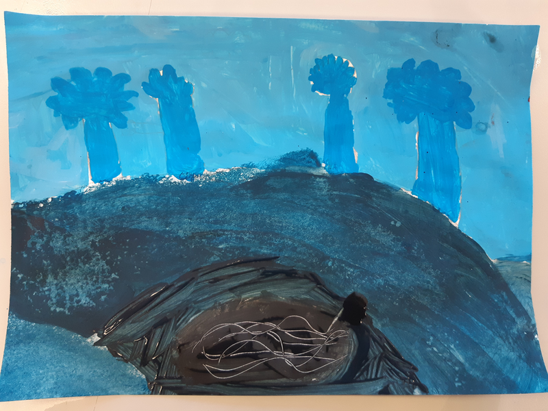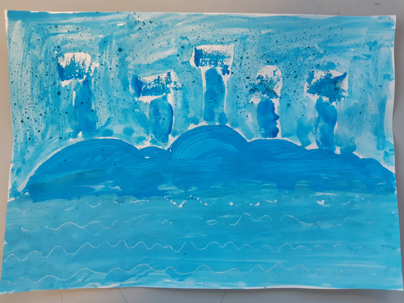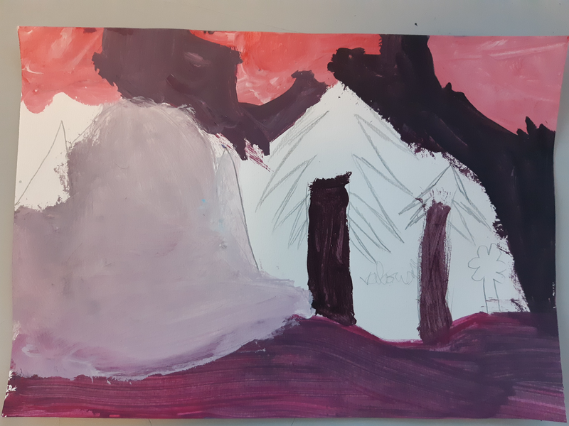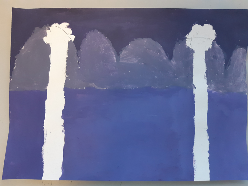J'ai utilisé l'éponge pour faire la mer en tamponnant. Pour le ciel, j'ai mélangé beaucoup de noir avec du rouge. Ça a fait une sorte de rouge bordeaux.