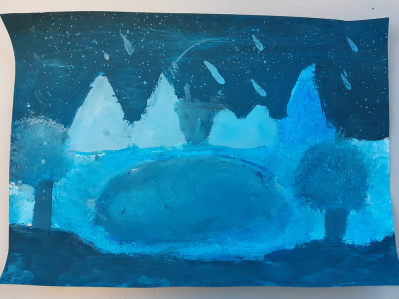 LE LAC : en premier, j'ai rempli la partie blanche du lac, puis ai l'aide d'une éponge, j'ai tapoté avec du blanc pour faire un léger dégrader, comme un effet d'optique.