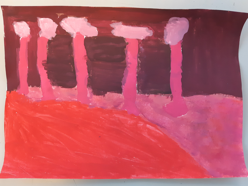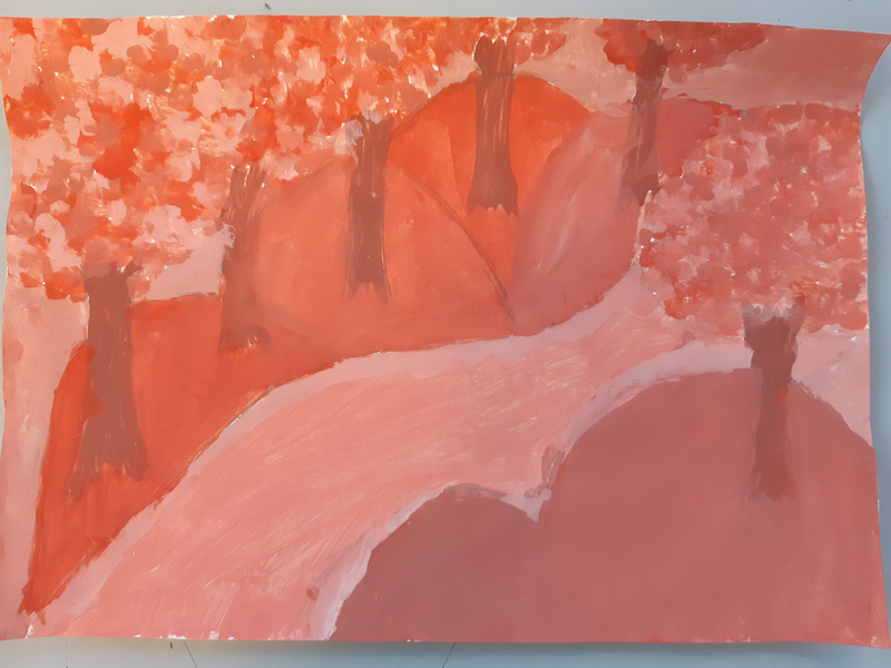 J'ai choisi de distinguer les arbres et leurs feuillages en les représentant avec un rouge un peu plus claire tirant sur le rose. J'ai dessiné les collines en utilisant du rouge sans en modifier la teinte.