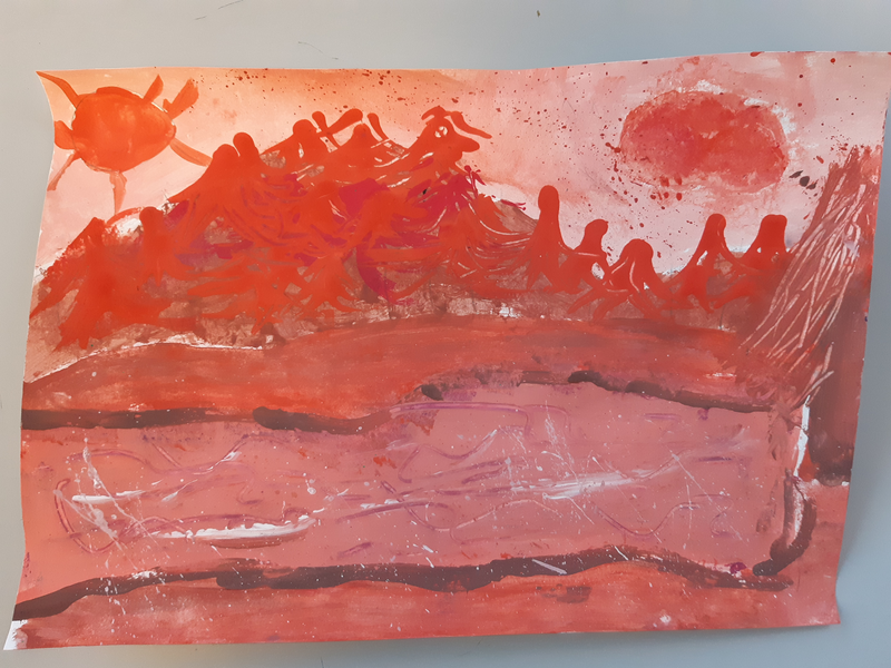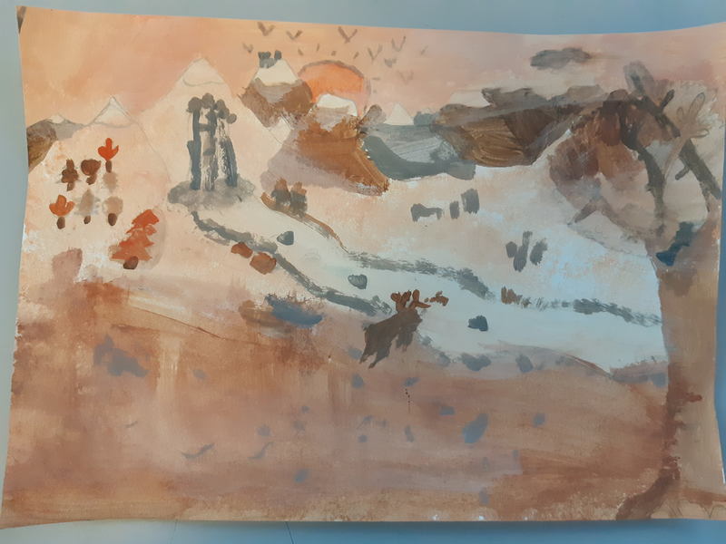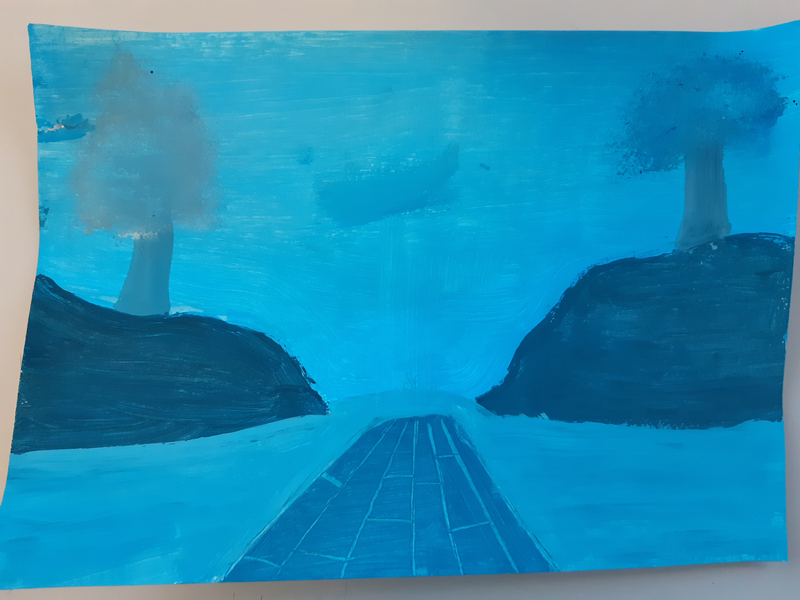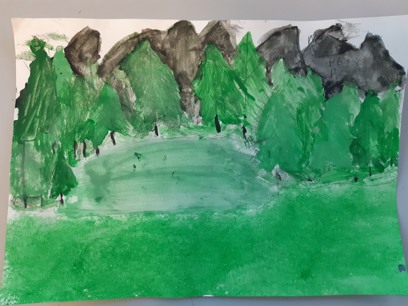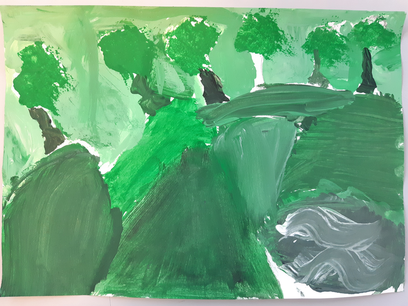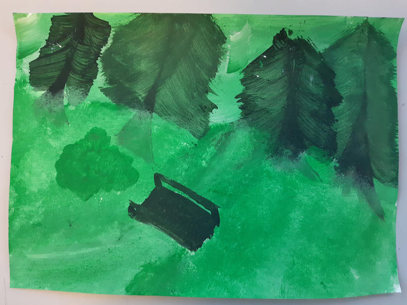 Tout d'abord, j'ai dessiné les troncs d'arbres avec un pinceau très fin en mélangeant du vert et du noir. Puis, j'ai fait à l'aide d'un gros pinceau le font de ma peinture avec du vert et un petit peu de blanc ( j'ai fais très attention de ne pas toucher les troncs d'arbres ).