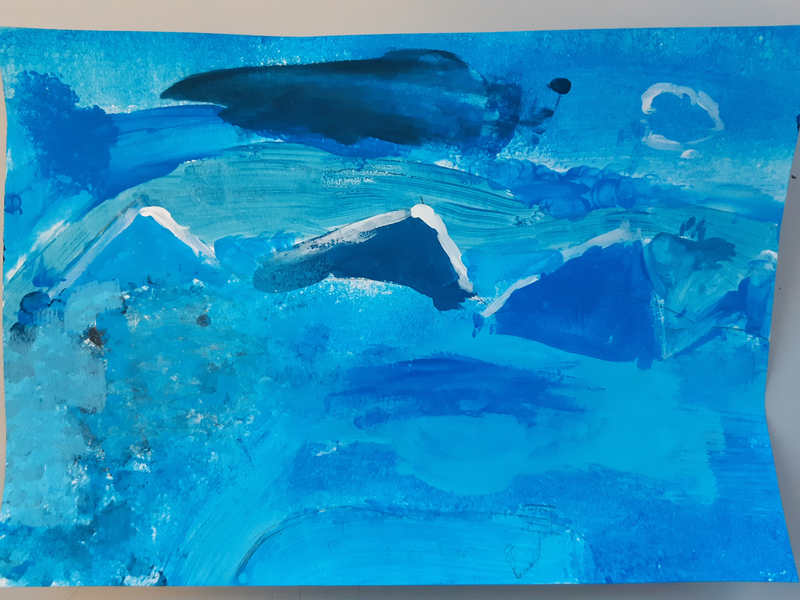 Pour finir, j'ai pris un gros pinceau, je l'ai trempé dans le blanc puis dans le vert. Je l'ai passé sur le fond petit coup par petit coup pour faire le vent.