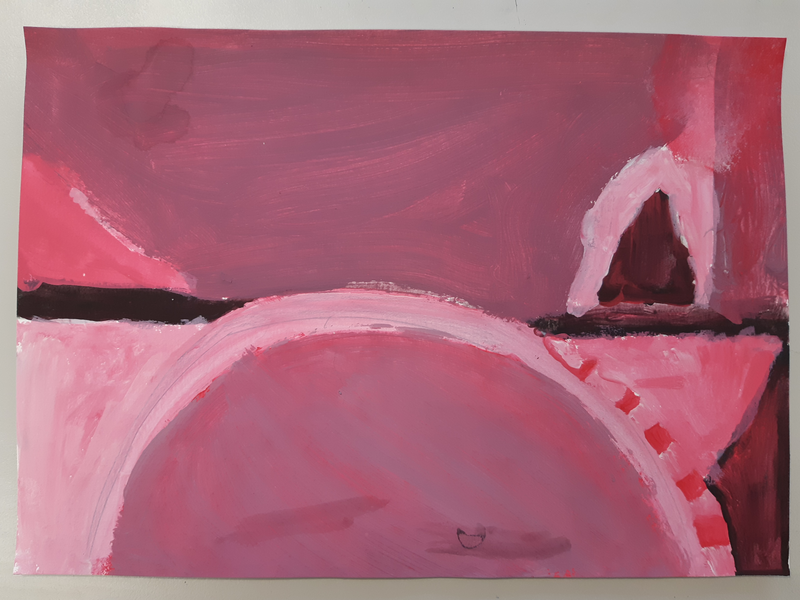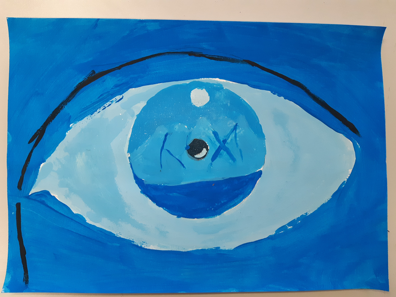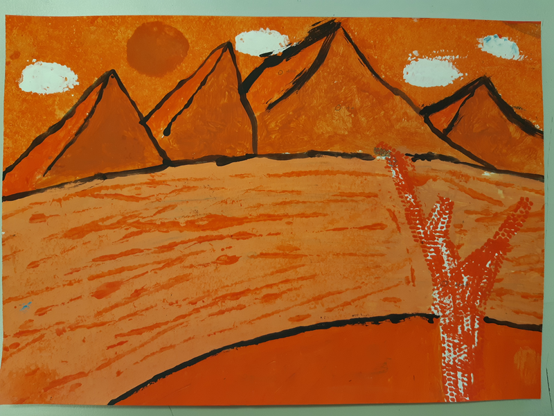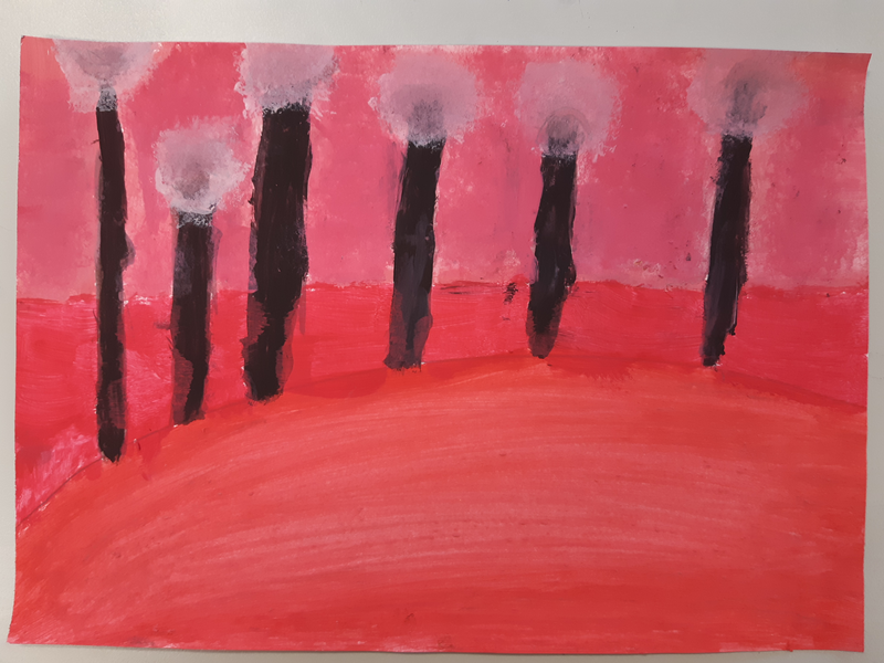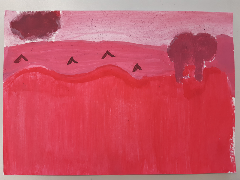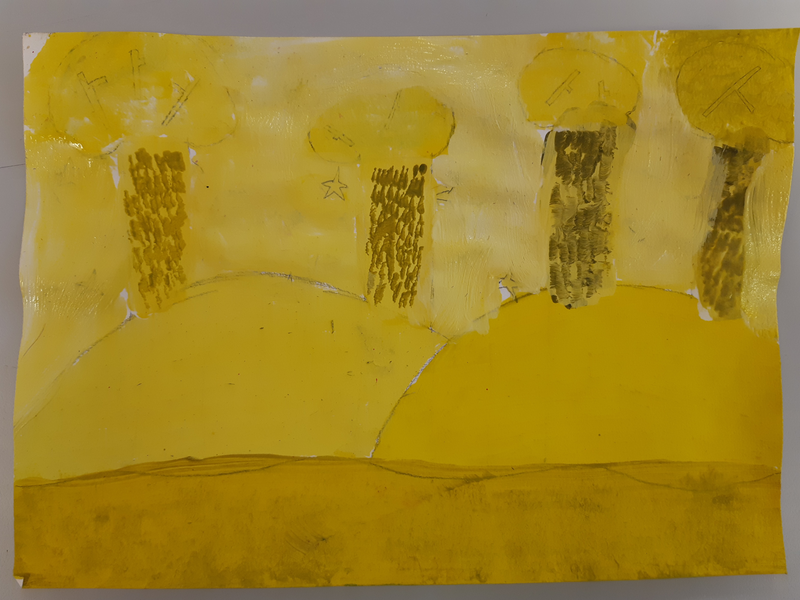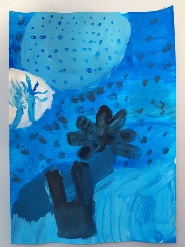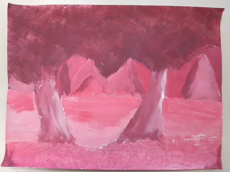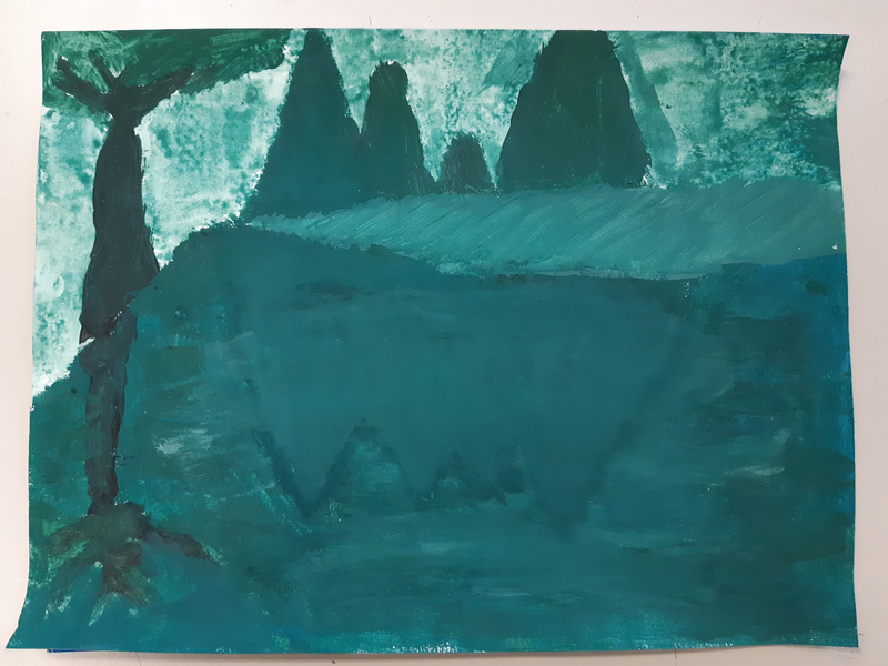 foncées. J'ai essayé de faire deux couches pour avoir un effet marbrées. Pour mon ciel j'ai reussi à diluer beaucoup ma peinture et cela a donner à mon ciel un effet nuage mais je l'ai eclairicie en fesant du lavis. pour mon arbre je l'ai fait au pinceau fin au vert tres fonce pour le tron et moins fonce pour le feuillage. J'ai utilisé beaucoup de nuance de vert. j'ai aimé tout faire car cela m'a fait sortir du crayon de couleur mais surtout du crayon à papier. En plus cela fesait longtemps que je n'avais pas fait de peinture.