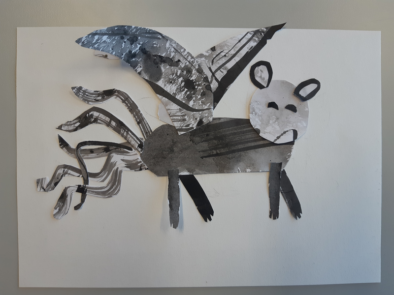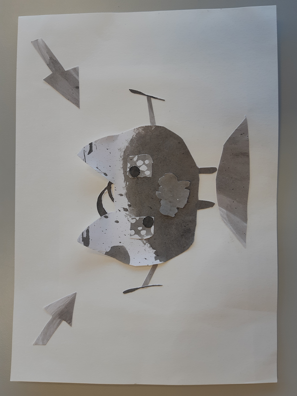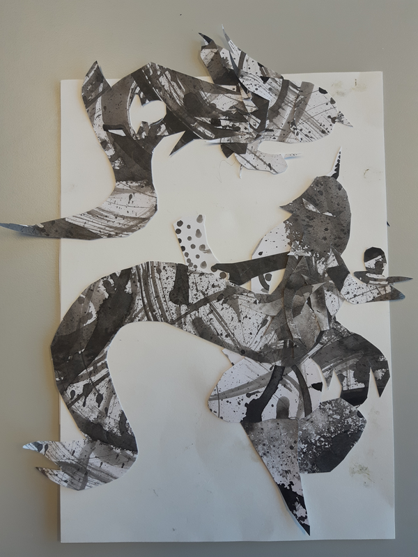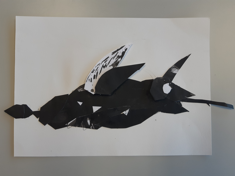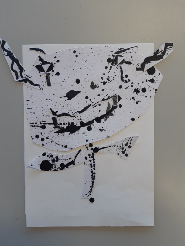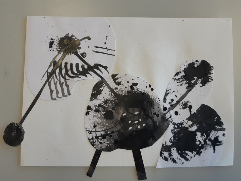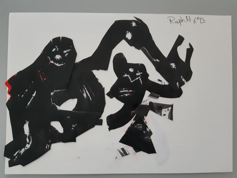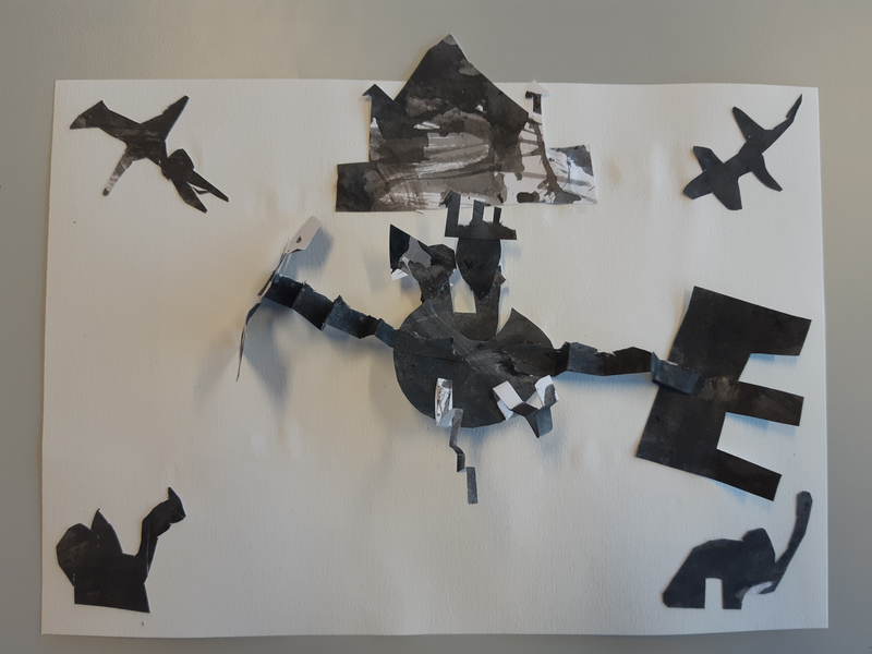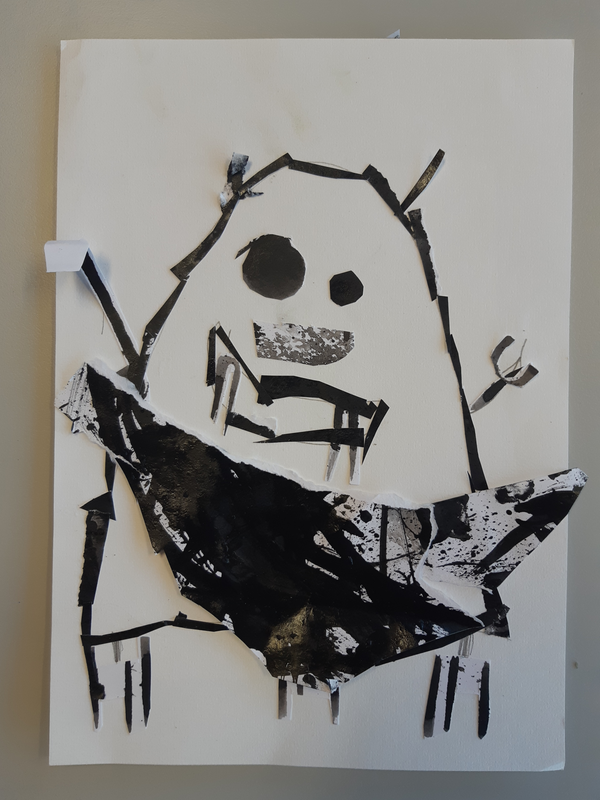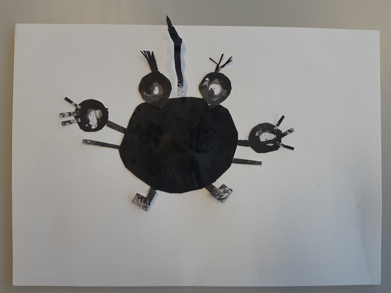 Au début j'ai découpé des formes arrondis avec un bout assez pointue, j'ai sélectionner des endroits aléatoires. Pour faire le fond j'ai utilisé des cotons tige plongé dans l'encre pour donner ces petits points. J'ai ensuite découpé deux formes en haut ronde avec plusieurs pointes pour donner leurs cheveux. J'ai ensuite assemblé le tout pour faire le corps. J'ai ensuite fait les bras dans des endroits également aléatoire. Pour finir j'ai fait les yeux, si jamais la tête était clair je fait les yeux foncé et inversement pour les faire ressortir et ensuite mis des détails en relief ou d'autres.. Je trouve que mes créatures ressemble au style de ODILON Redon.