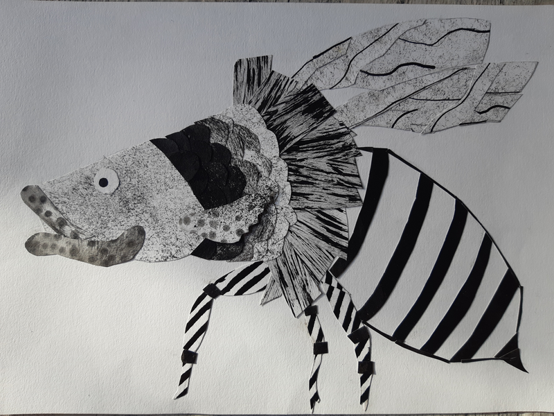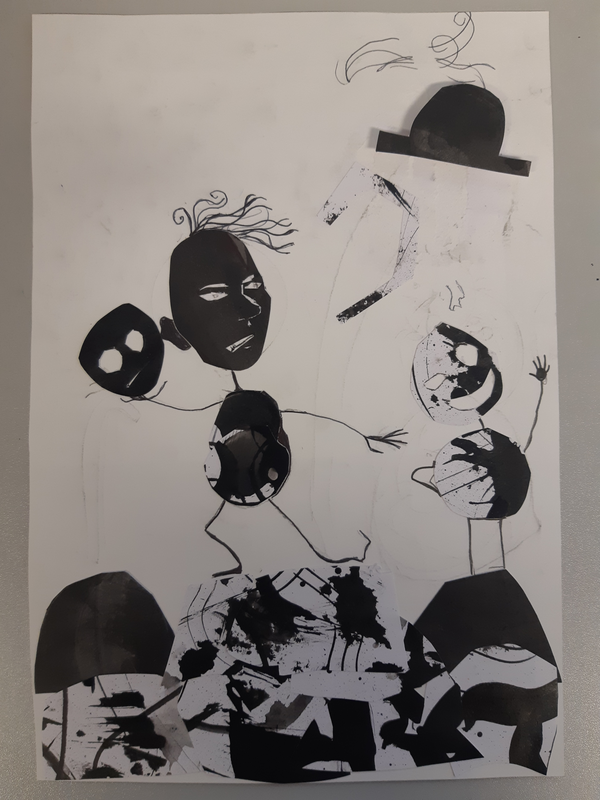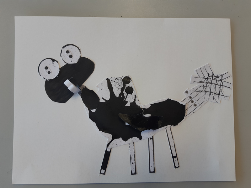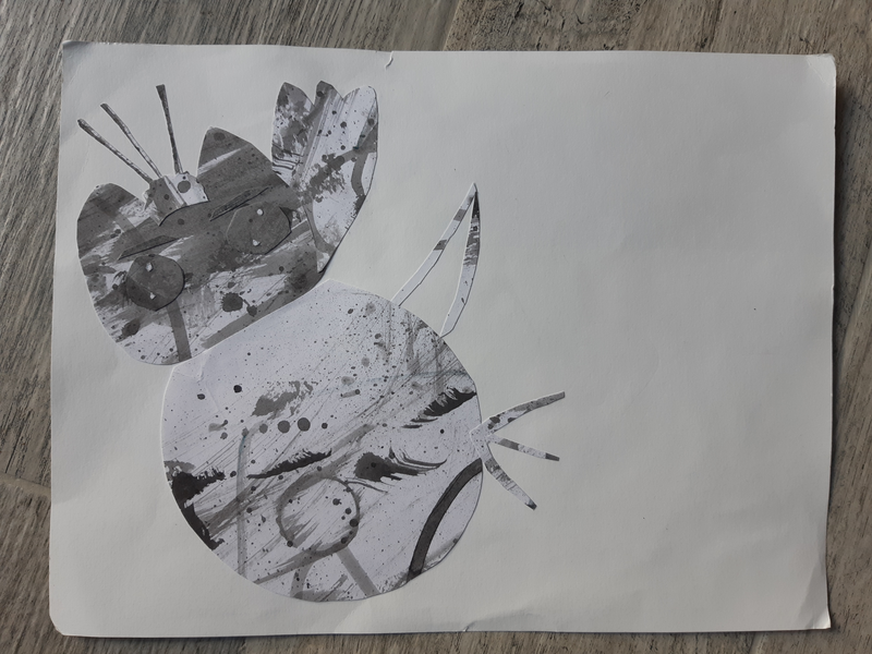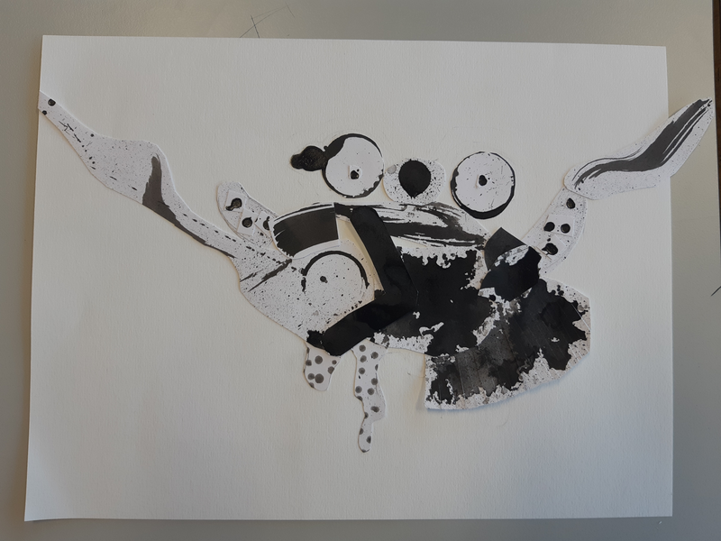 Pour le corps, j'ai découpé une large forme mouchetée de tâches d'encre plus ou moins diluée. Je l'ai déposé entre les papiers déjà découpés. Puis, satisfaite de ce que j'avais déjà réalisé, j'ai commencé à coller.