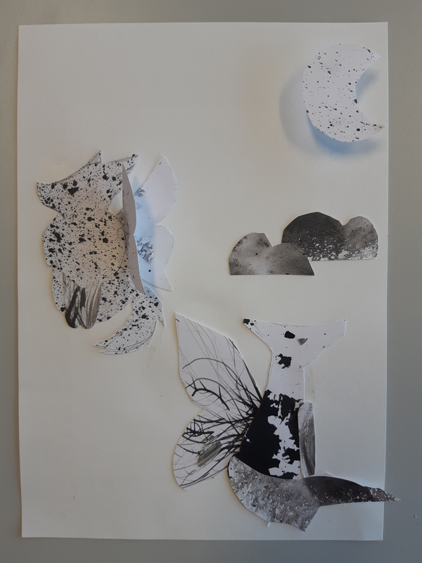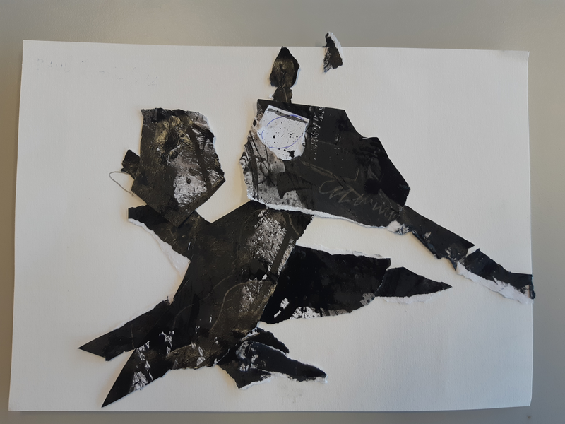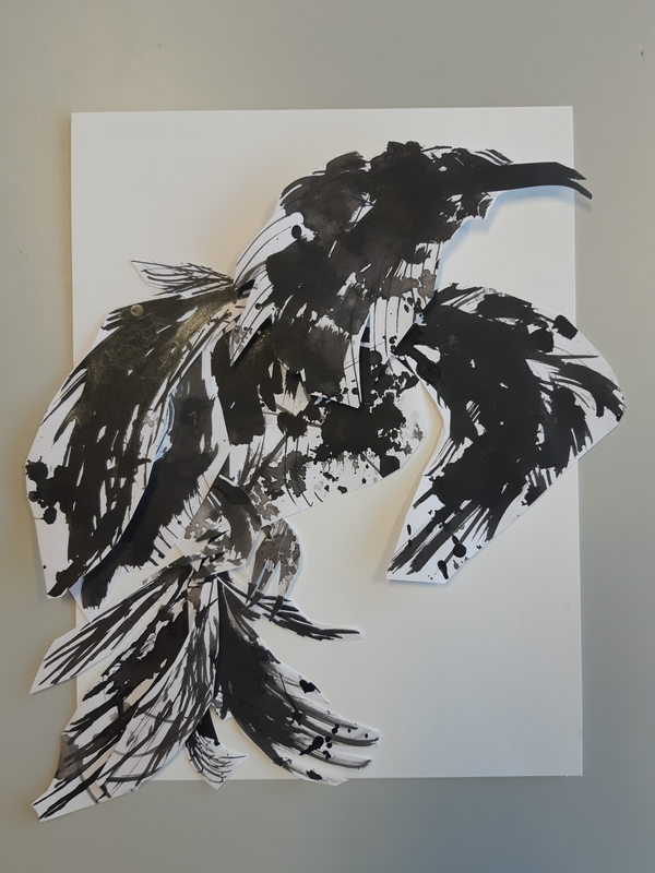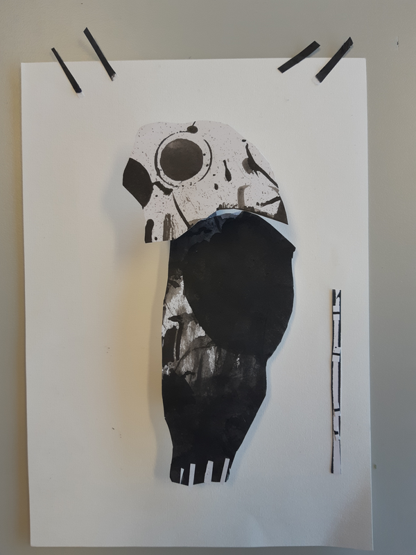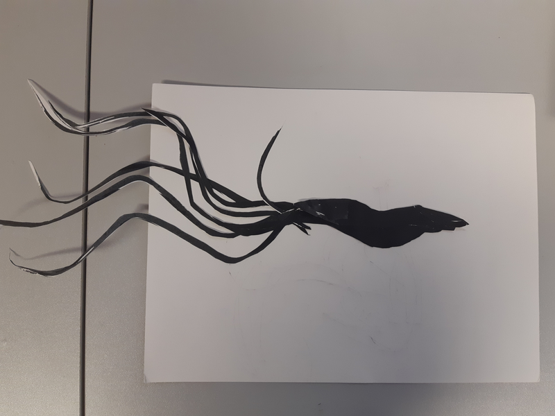 Tout d'abord, en observant les formes dessinées dessus, j'ai repéré une jolie tête d'oiseau ayant légèrement la forme d'une plume. Ce motif était très présent dans ma feuille. Je l'ai découpé avec d'autres formes similaires et je les ai assemblés sur ma feuille en format horizontal. Après avoir tenté cinquante positions différentes, j'ai pris une feuille plus grande et je l'ai tournée verticalement. J'ai trouvé une place à chaque motif en formant une sorte de corbeau semblant s'élancer hors de la feuille. Les autres plumes formaient les ailes et la queue.