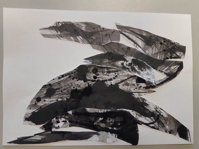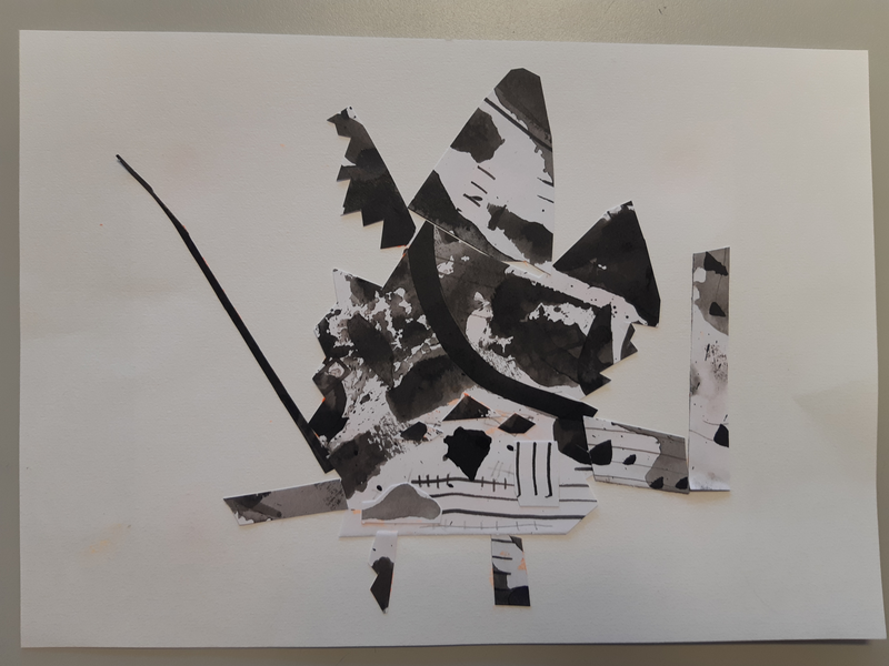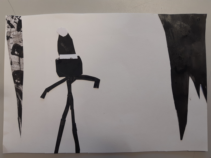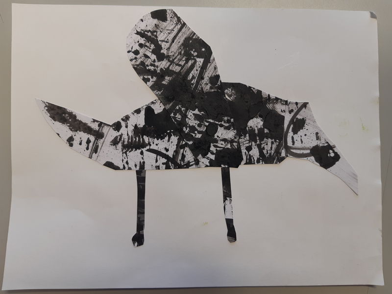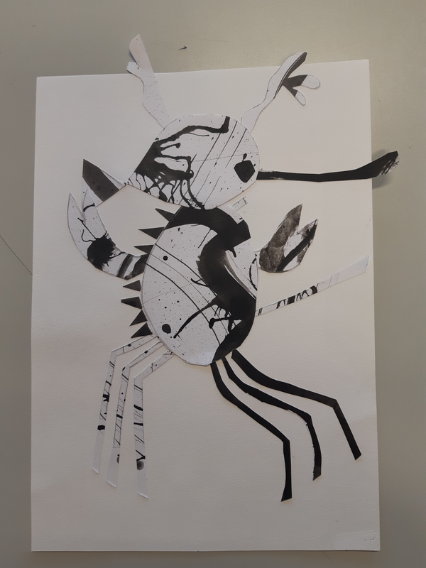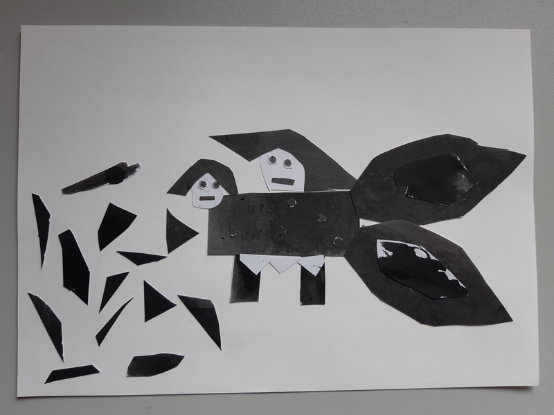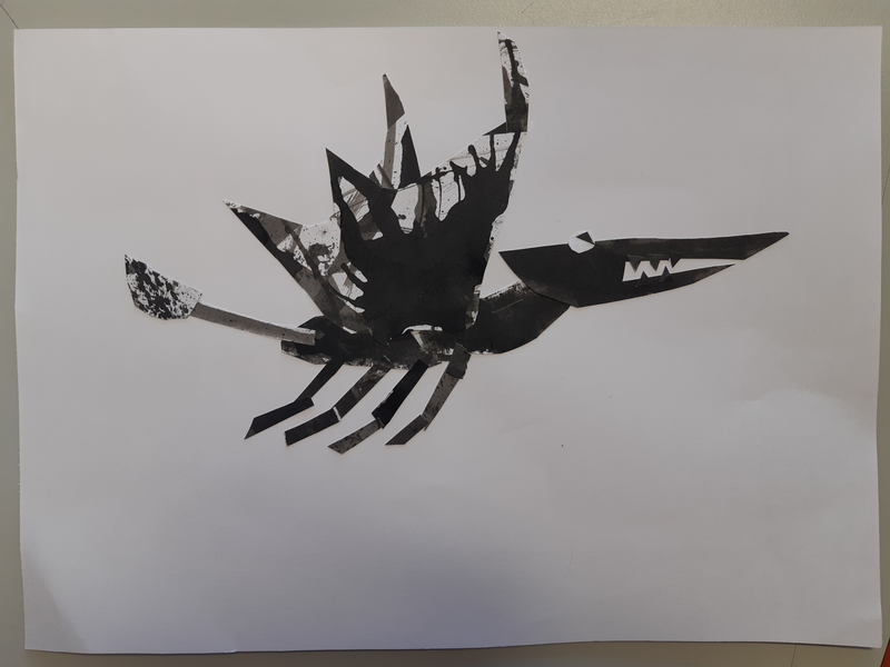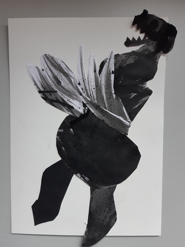 Pour commencer j'ai decoupé une forme ovale sur la feuille d'encre pour faire le corps du monstre Cette tache qui a été tracé aux pinceaux elle été noir sombre . Ensuite la tete et de forme rectangulaire a été découper sur un dégradé. Puis pour les ailes j'ai découpé une forme que j'avais en tête les ailes étaient brossées d'un noir clair . Et pour finir les pates je voulais les différencier ses pour ca que l'une et claire et que l'autre et noir voila.