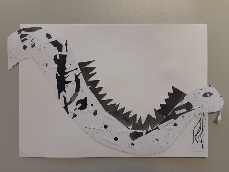 J'ai commençais par dessiner la forme du serpent . Ensuite je l'ai découpée puis je l'ai collée . J'ai utilisée mais traits fins pour faire la barbe .