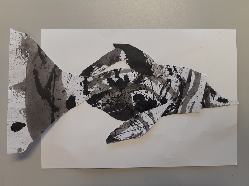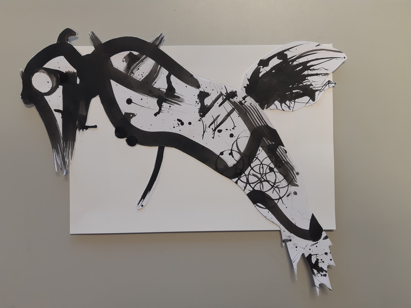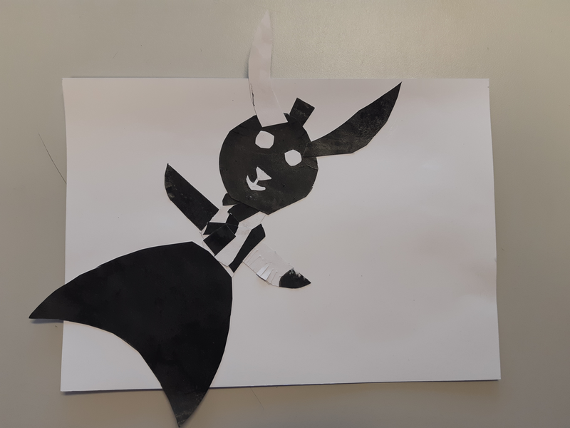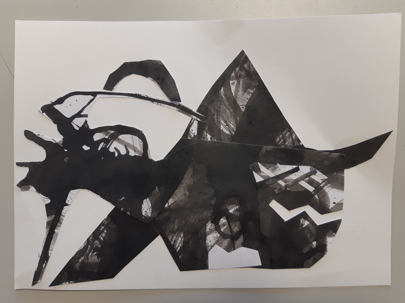 J'ai découper avec l'encrage j'ai fait une main j'ai fait une langue avec une fourche sur la langue j'ai pris une grosse tache pour faire une tache de guerier j'ai pris des