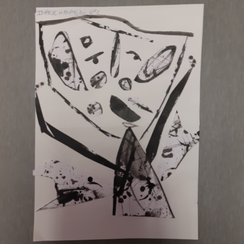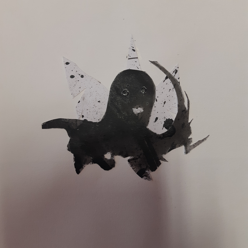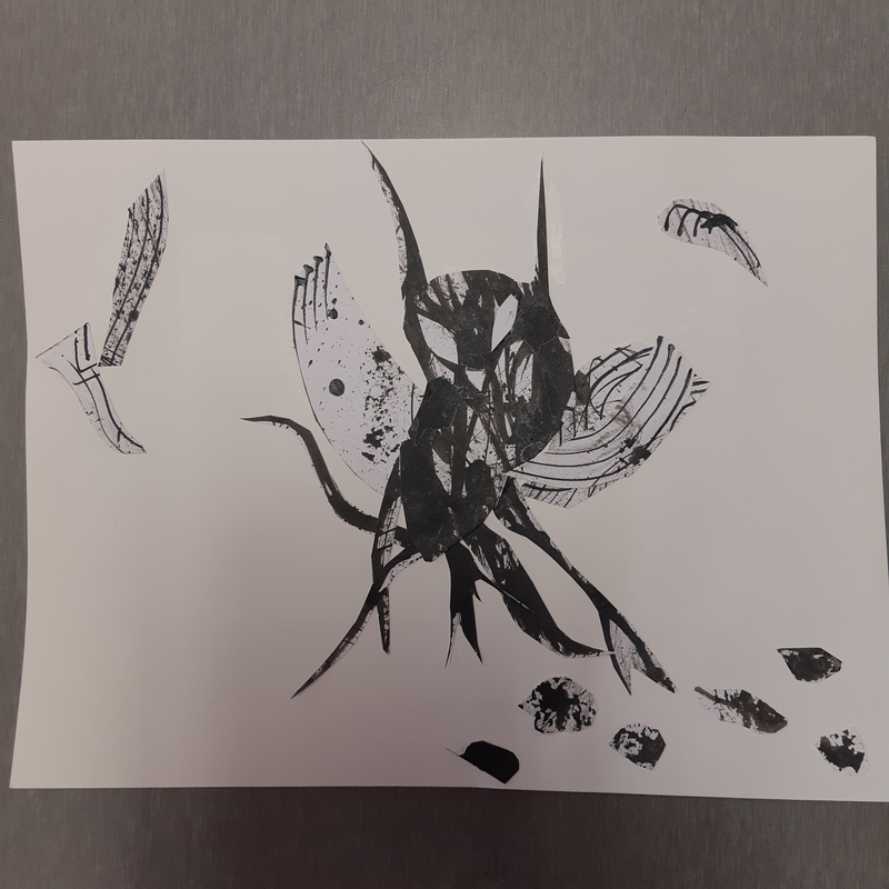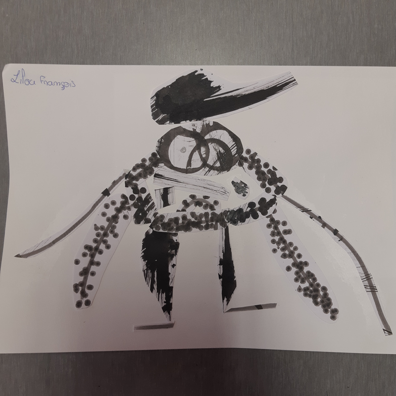 pour commencé j'ai découpé des formes aléatoires sur une feuille où nous avons fait projeter, étaler, diffuser, souffler, diluer, de l'encre de chine . Puis, j'ai collé les morceaux de feuilles découpées sur une feuille blanche . j'ai représenté une créature hybride . les griffures d'encre avec la fourchette représentaient des ailes d'oiseaux . Les piques d'encre avec le pinceau représente des cornes et des tentacules .