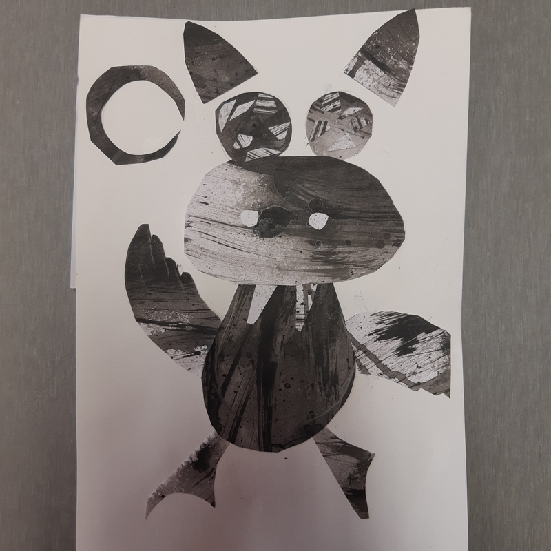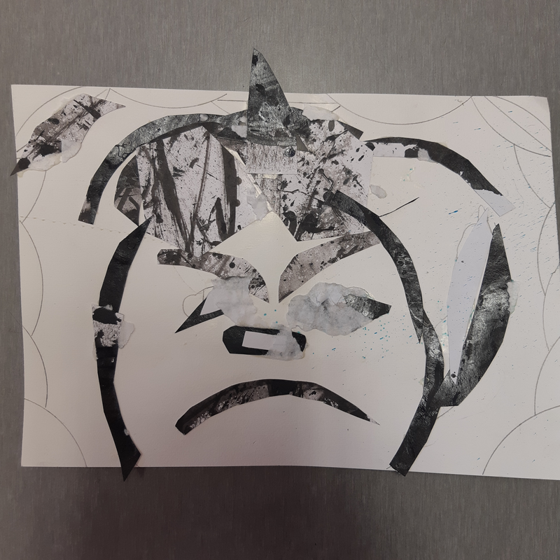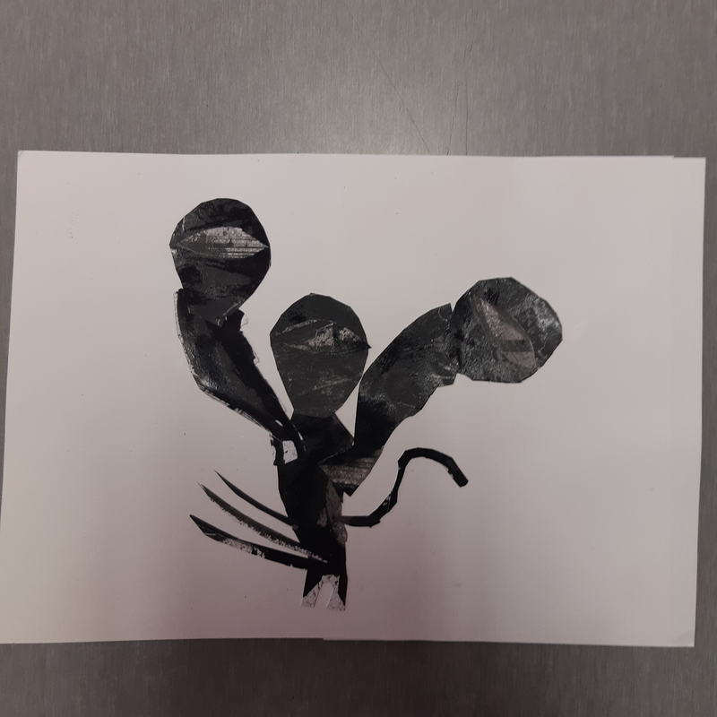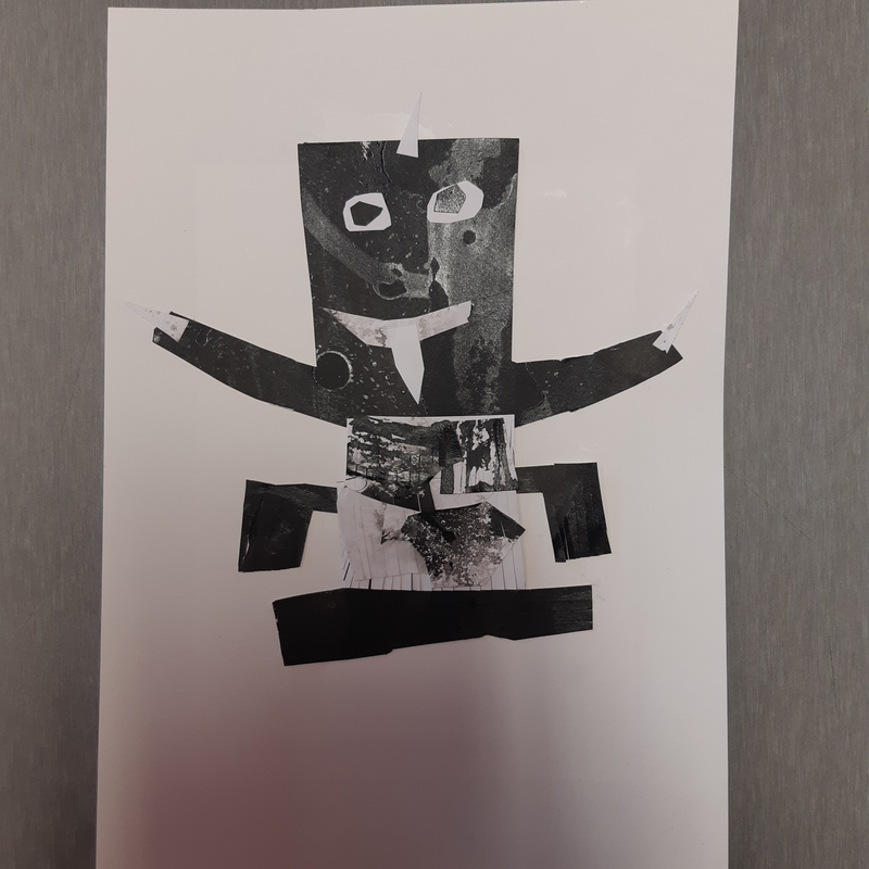 J'ai réalise une créature hybride pour ça j'ai découper un morceau d'aplat noire pour faire le corps et trois tête noir et trois yeux plus aéré puis trois cou toute aussi noire. Ensuit j'ai découper des griffes à moitié noire et de l'autre tacheter puis ensuit une tentacule qui faite des zig zag toute noire. La tentacule est sur le devant.