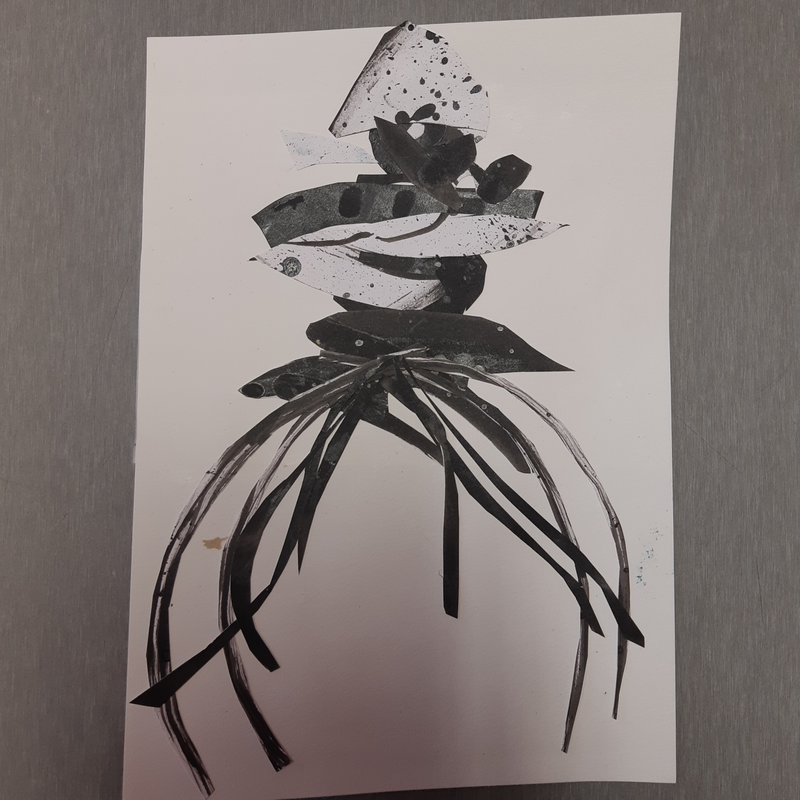 Ensuite , j'ai examiné ma feuille recouverte d'encre. J'ai trouvé le nécessaire pour réaliser une oeuvre ... J'ai découpé tous ce qui me plaisait .