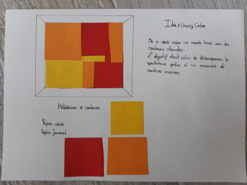 le but de ce projet est que le spectateur se sente perdu dans ce flux de couleur chaudes. Pour cela nous avons utilisés des morceaux de papier colorés afin de permettre au spectateur de ce laisser divaguer dans ses couleurs