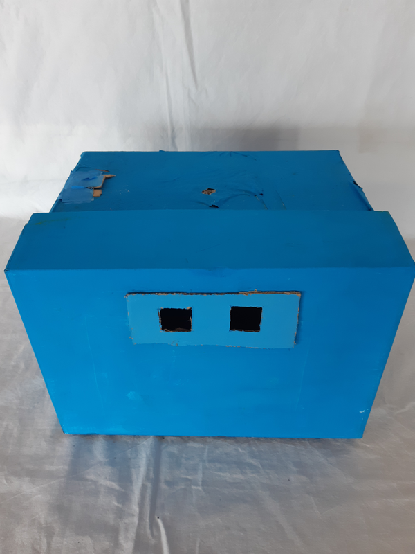 3. À l’extérieur de la boite : Sur les parois extérieures de la boite et le couvercle, nous avons collé du papier journal qu’on a ensuite peint en bleu.
