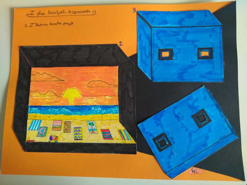 1 Nous avons représenté une plage de sable en premier plan avec un coucher de soleil en second plan. La musique d’accompagnement de notre projet est celle du film des « Dents de la mer ». Le but était d’associer un environnement apaisant et relaxant comme la plage en été avec une musique stressante comme celle des « Dents de la mer ». On souhaitait que le spectateur soit gêné et stressé et ne sache pas à quoi s’attendre.