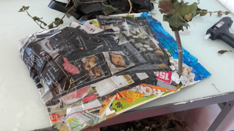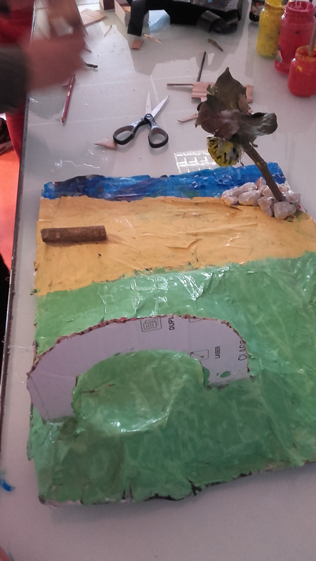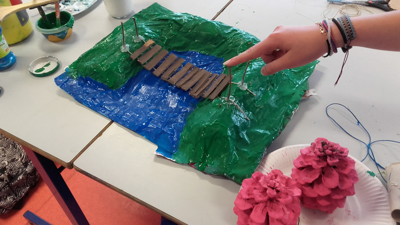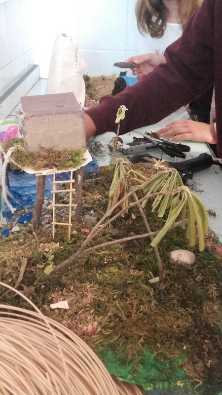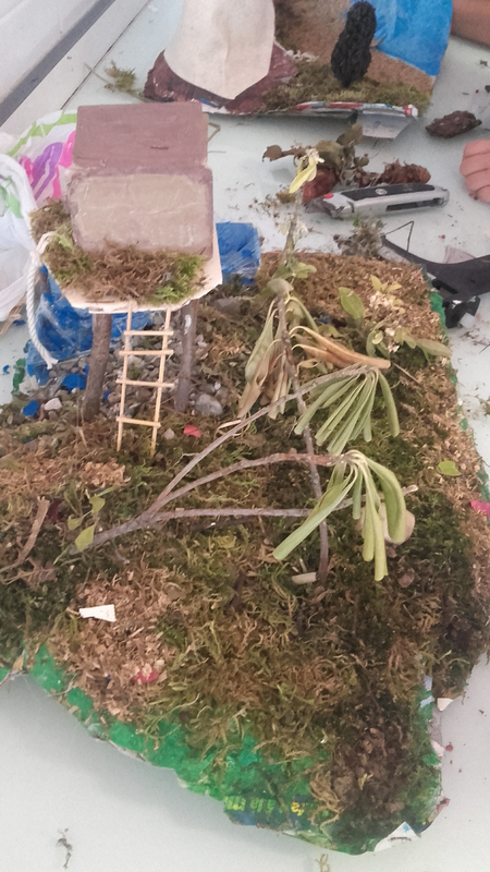 Suite à cette étude, les élèves ont réalisé des maquettes de jardins selon des modalités variées : terrains réalisés en papier mâché ou en mousse expansée... Une contrainte imposée était de réintégrer "une cabane perchée" réalisée en 6° et que certains groupes avaient conservée dans la réserve de la salle d'arts plastiques.