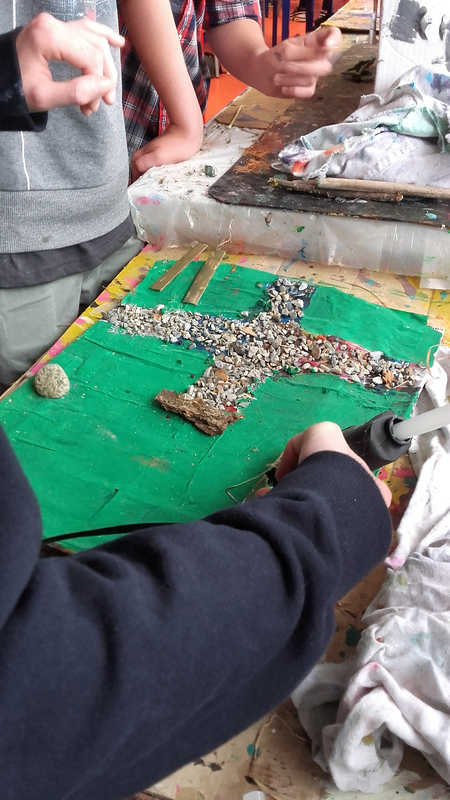 Les élèves ont cherché à réaliser des terrains au relief varié en fonction du jardin choisi à composer. Le choix des matériaux a été aussi sujet à discussion entre élèves afin de "coller" au mieux à la réalité.