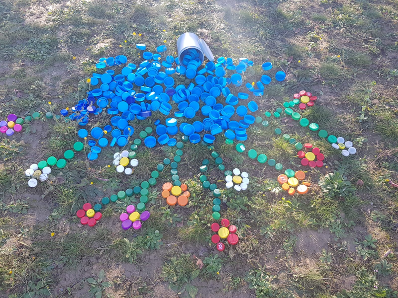 Nous avons ensuite formée des fleurs de plusieurs couleurs différentes que nous avons reliées aux autres bouchons avec des tiges vertes.