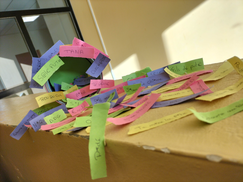 On as choisi ce lieu car c’est dans un couloir que tout le monde prend a plusieurs moments de la journée, et donc un endroit ou des gens pourrait librement déposer des petits papiers d’insultes pour une certaine personne.