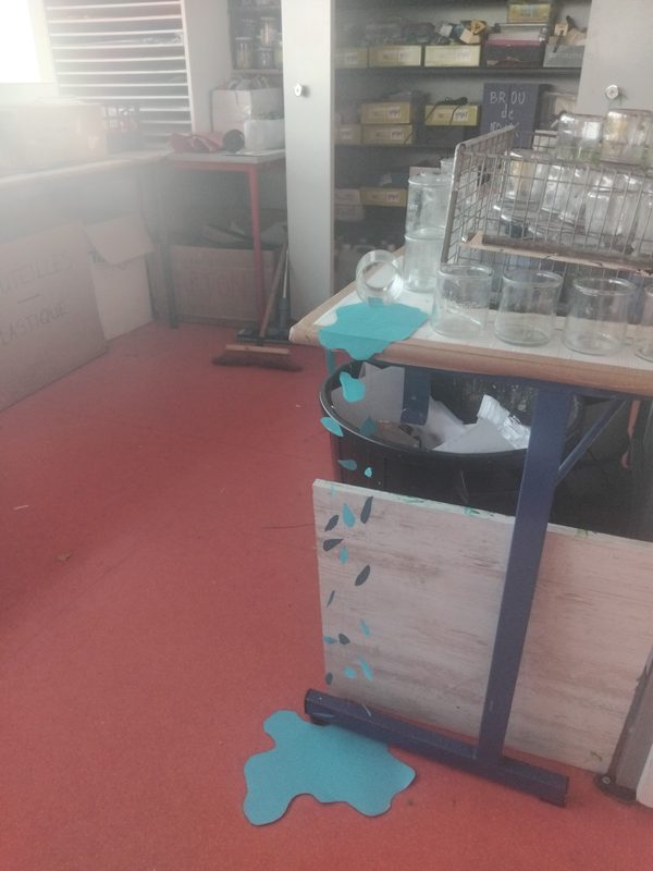 Nous avons choisi de réaliser une expansion de plastique qui sort d’une bouteille pour former un planisphère composé uniquement de déchets de récupération (plastique, papier, bouchons, sachets de pâtes ou de pommes de terre, etc.).