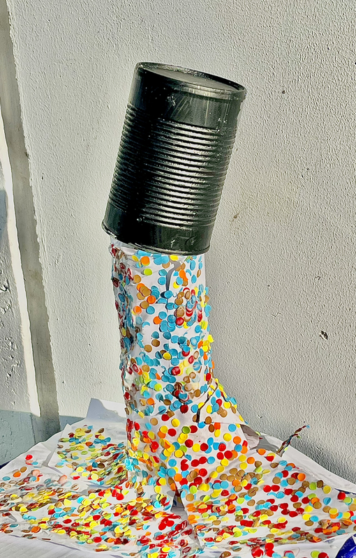 Nous avons poinssoner dans plusieurs feuilles de couleurs pour faire des conffettis . Nous avons ensuite peint la boite de conserve en noir. Apres nous avons pris du carton et l'avons roulé en cylindre pour colle autour un feuille blanche, puis nous avons fait de fentes dans une autre pour entouree le cylindre.