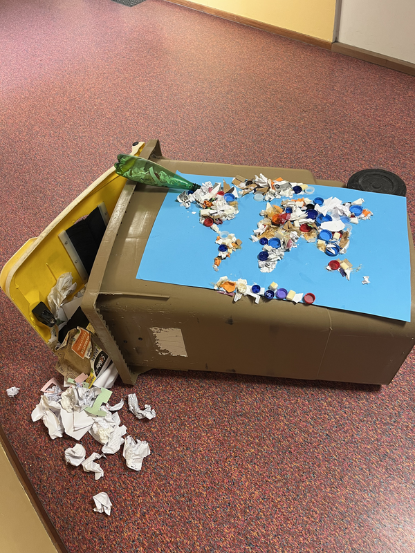 Ensuite, nous avons placé notre travail sur une poubelle pour faire passer un message aux personnes qui ne respectent pas la planète.