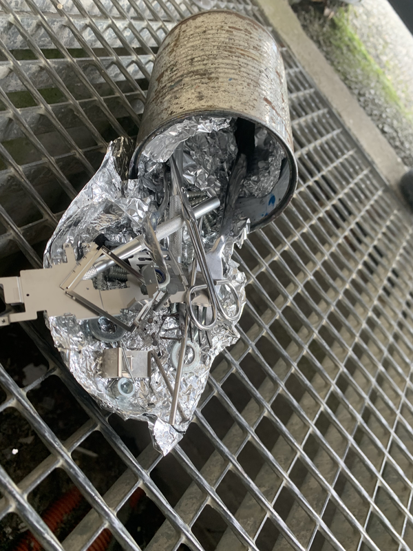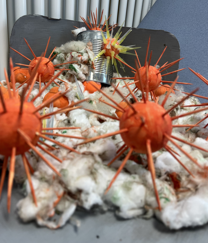 Pour notre composition, nous avons positionner la boîte de conserve dans le coin de notre support. On a mis sous la boîte là-bas rebondissante pour pouvoir disposer tout autour d’elle le coton. Ensuite nous avons rajouté sur le coton toute nos virus. Nous avons également collé le demi virus sur la boîte de conserve. On a également rajouté les des pics en plastique pour réaliser la cristallisation du virus. On a même collé le coton sur la boîte.