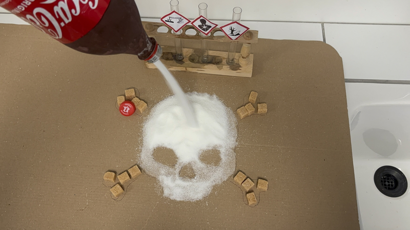 Pour réaliser cette expansion, nous avons fait s’échapper de la bouteille une étendue d’étoffes de différentes couleurs et de matières, de sorte à ce qu’elles ne fassent plus qu’un avec la robe du mannequin préalablement conçue. Nous l’avons fait grimer jusqu’à celui ci de sorte à dénoncer notre rôle dans le développement croissant de cette industrie.