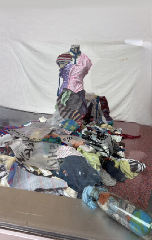 Nous avons réalisé l’installation devant une vitre semblable aux vitrines de magasins. Nous avons posé la bouteille horizontalement sur un rebord de la vitre, puis mis en place l’étendue des tissus ainsi que du mannequin. Ensuite, nous avons disposé l’ensemble des textiles que nous avions a disposition au sol, de sorte à former de vagues de tissus donnant du volume et du dynamisme à l’installation. A travers ce procédé d’entassement, nous dénonçons la création à la chaîne massive de ces entreprises de fast-fashion. Nous avons ajouté des sacs plastiques venant de chez Shein pour dénoncer l’arrivée de ce géant de l’ultra fast-fashion au BHV à Paris.