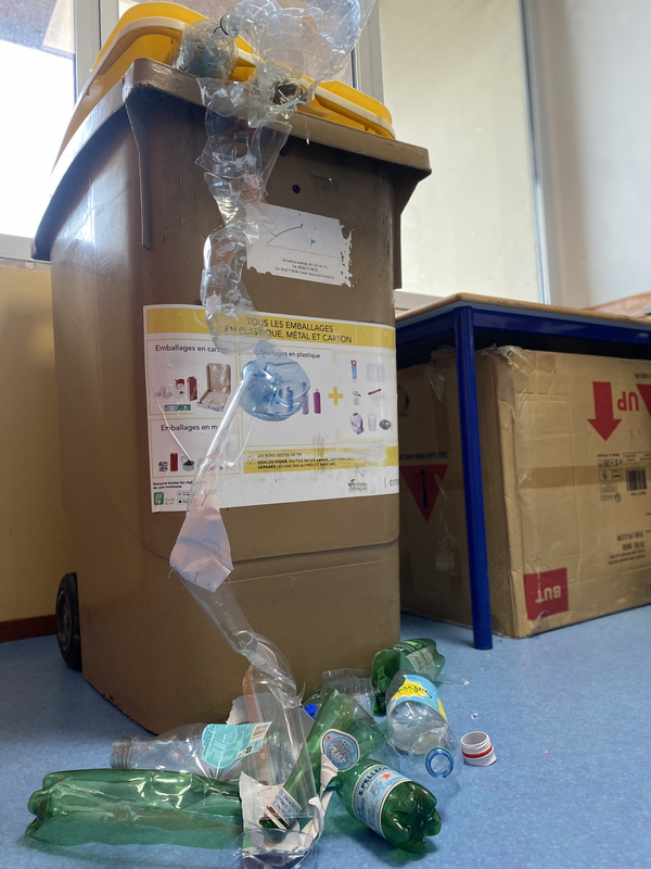 Nous avons choisi une bouteille en plastique que nous avons coupée dans le sens de la longueur, puis placé la Terre, peinte en bleu et vert sur du polystyrène, ainsi que des fragments de tissus pour montrer que le globe est entouré de plastique et de tissus dû à la surconsommation de ces derniers.