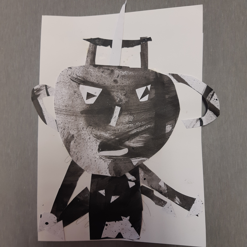 Ensuite nous avons découpé dans notre feuille pleine d'encre pour réaliser des formes d'animaux etc... je l'ai appeler Gaston le dragon il me fait penser a l'oeuvre d'Odilon Redon car le fond est blanc et que certaines partis sont en noir et aussi celle de Pierre Boucher car il y a du noir et du blanc