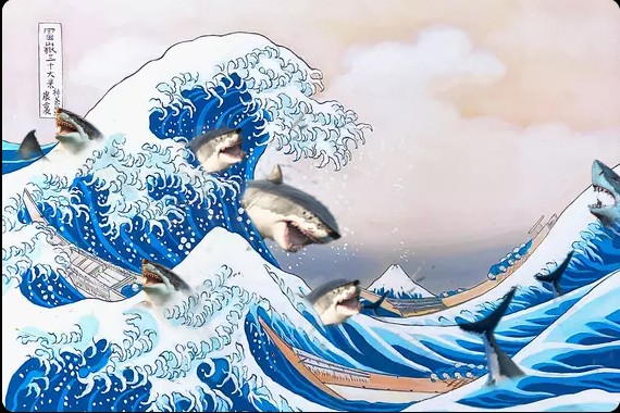J'ai choisi de faire une invasion de requins sur le tableau la vague de KANAGAWA qui représente une tempête et pour faire un ère dévastateur (catastrophique) j'ai rajouter des requins qui attaque les bateaux pratiquement submergé par l'eau. Ce tableau avec de l'encre. Sur ce travail j'ai fait une altération (Opération qui consiste en une légère modification d'une partie de l'œuvre).