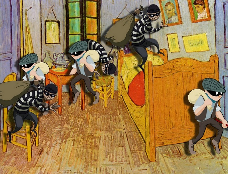 Elle a été réalisée par le peintre Vincent van Gogh en 1888. Elle se trouve au musée Van-Gogh à Amsterdam. Les bandits sont utilisés de manière caricaturale, portant des bonnets et des sacs de butin, et ils envahissent la chambre. Cela rappelle les nombreuses histoires de vols célèbres dans le monde de l'art, soulignant la fragilité de la sécurité des œuvres d'art, même les plus précieuses et renommées. J'ai manié la superposition d'images,puis J'ai appliqué des techniques de masquage et de calque et j'ai ajusté les proportions et la perspective.