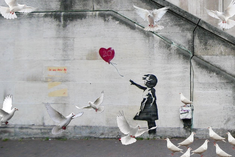 On peut y voir une petite fille taguée sur un mur qui tend la main vers un ballon en forme de cœur. Elle symbolise l’innocence perdue mais à la fois présente, personnellement je trouve que derrière cette œuvre, il y est aussi représenté la liberté. La petite fille peut très bien attraper comme lâcher ce ballon, signe qu’elle est libre de ses tourments.