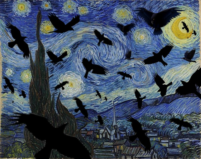 On peut voir que l’œuvre de base représente une nuit paisible dans une ville, j’ai utilisé la profondeur et l’espace pour rajouter des corbeaux qui peuvent remplacent les avions attaquant la ville comme lors de la guerre en Ukraine.
