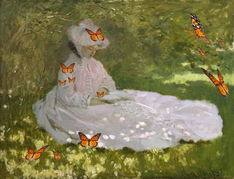Ainsi que la fille, du coup je ne voulais pas qu’il y ait pas trop de papillons pour ne pas la cacher. J’ai modifié les papillons avec l’outil distorsion, pour les déformer et avoir l'impression qu’ils bougent. J’exprimes l'invasion à travers les papillons le fait de les avoir positionnés à différents endroits sur la toile on a l'impression que la liseuse est tranquillement installée et qu’une nué d’insectes est en train d’arriver et envahir son environnement. Cette œuvre se rapproche de l’œuvre « La Balançoire » de Auguste Renoir, avec les jeux de lumière. Auguste Renoir est aussi un artiste impressionniste.
