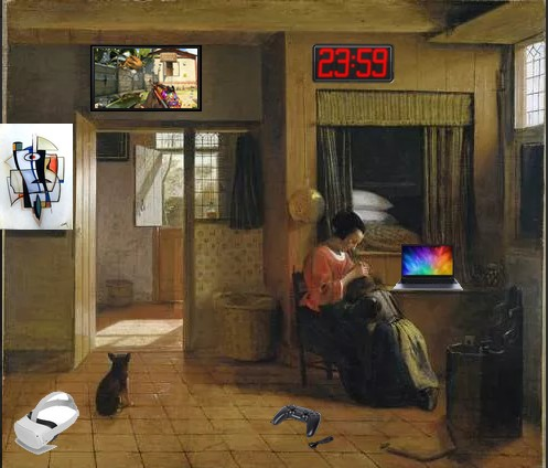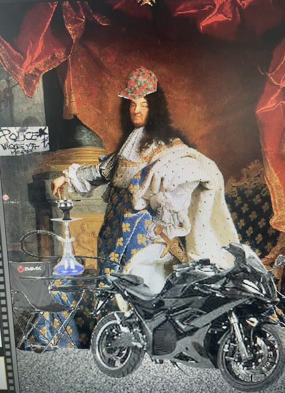 J’ai choisi l’œuvre le: “portrait de Louis XIV en costume de sacre”qui a été réalisé en 1701 par le peintre français Hyacinthe Rigaud. Je l’ai envahit d’objets et préjugés que l’on a de la cité et la délinquance, j’ai mis un sol de rue, une moto, une chaise de camping ( car il s’en serve au quartier pour guetter ou autre), une chicha, la casquette Gucci fraise et à gauche un graffiti où il y’a écrit « police nique ta mère». Je l’ai transformé d’un tableau de l’époque avec la richesse et l’élégance en un tableau remplit de pauvreté, de délinquance et de désespoir. Et j’ai montrer ce que devient ce que devient la société de nos jours